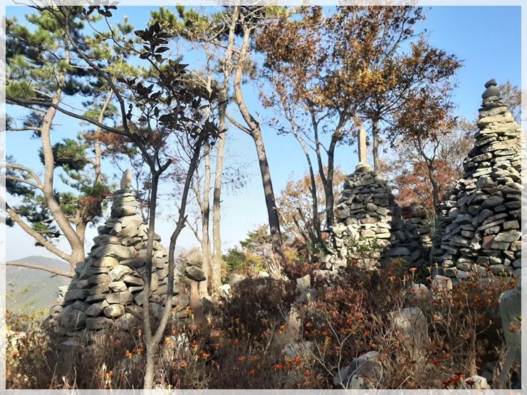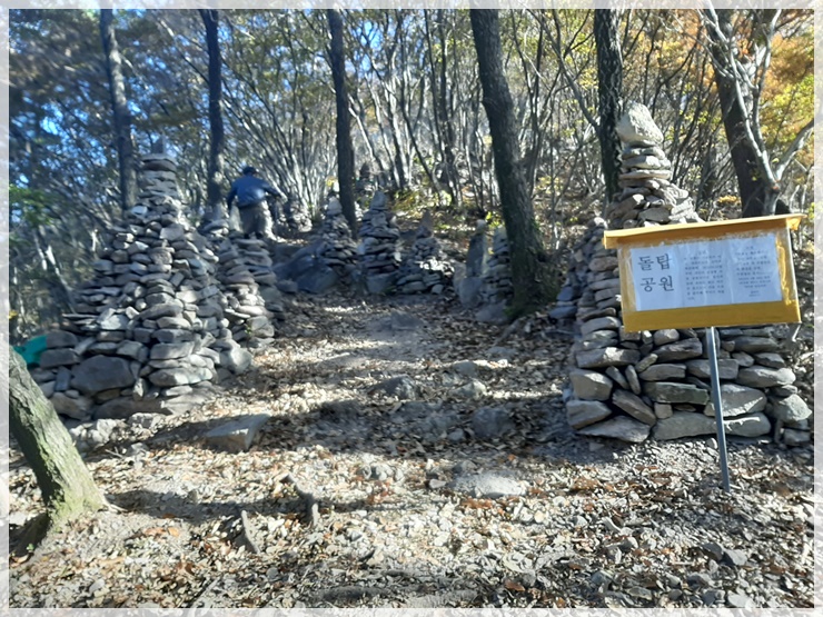 미광하이츠를 출발하여 지난번 우회했던 약수봉으로 향합니다. 약수봉 정상이 가까워져 가면서 돌탑들이 하나 둘 보이더니 돌탑공원이 나타나고 정상 근처에 아저씨 한 분께서 돌탑 쌓기에 열중하고 계십니다. 공심소(空心所)라 이름 붙인 명당자리도 있는 것으로 보아 분명 마음 비움으로 돌탑을 쌓고 계신가 봅니다.