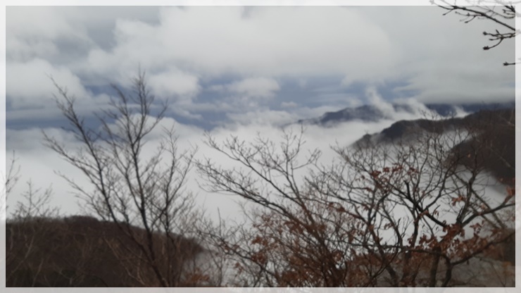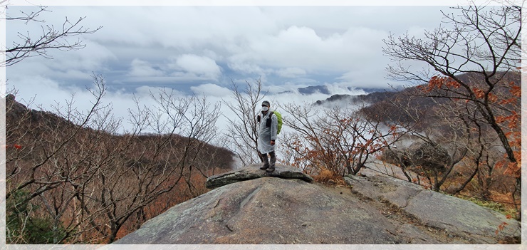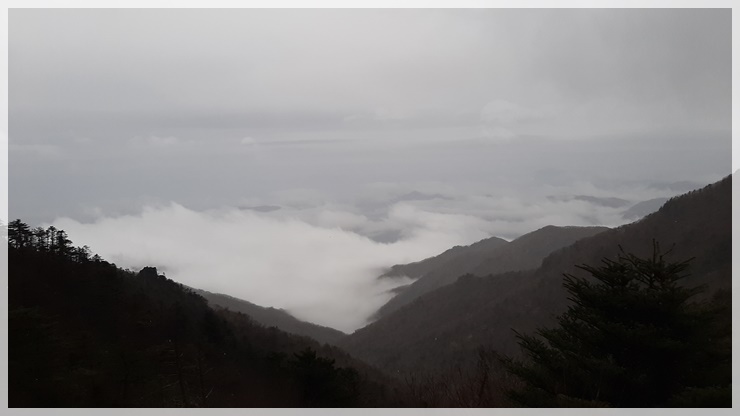 순두류에 내려서니 보슬비가 내립니다. 로타리대피소 오르기 까지 그 비를 홈빡 다 맞았습니다. 우의 입고 법계사 뒤 바위 전망대에 올라서니 중산리 계곡에 멋진 운무가 깔렸습니다. 비 맞고 지리에 든 보람이 있습니다. 비옷 입고 나니 이제 비가 내리지 않습니다.