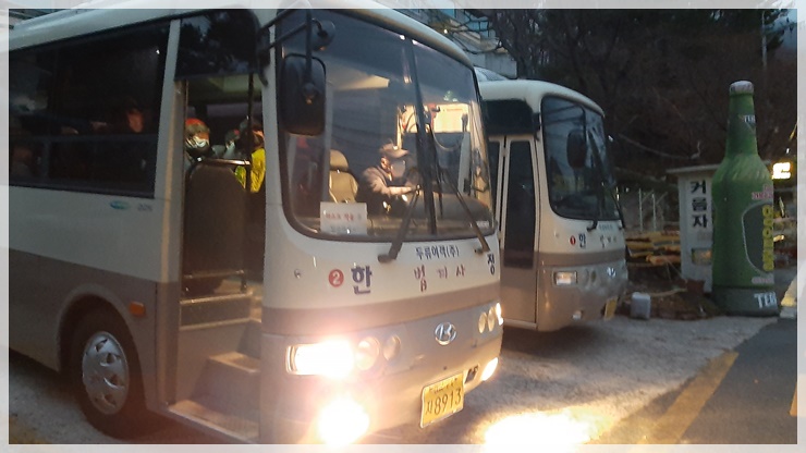 중산리 거북이식당에서 아침식사 도중 순두류까지 버스 타자했는데 버스 출발시간이 다 되었는데도 덕규 형님이 보이지 않습니다. 큰 거 보시다 급히 자르고 버스에 올랐습니다.