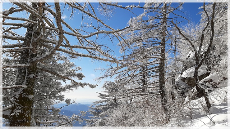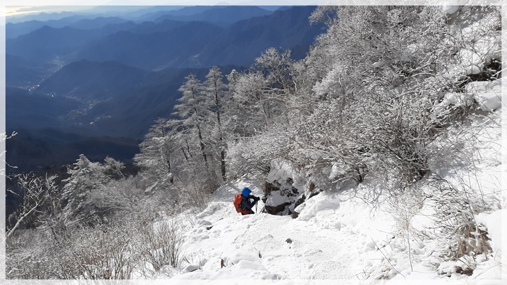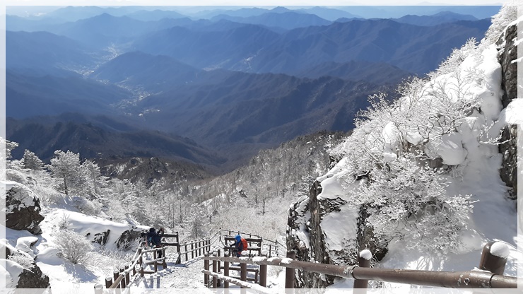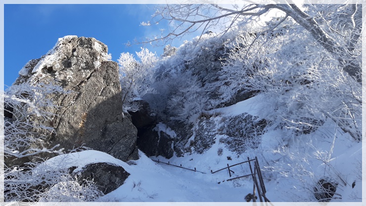 이제부터는 등로에 눈이 제법 많이 쌓여 있습니다. 돌계단이 눈 속에 덮여 걷기가 한결 쉬워졌습니다. 개선문 지나서부터 겨울정취가 물씬 풍겨나는 그런 경치가 나옵니다. 이 모습이 보고 싶어 앙코가 겨울지리를 찾는 이유입니다. 덕규형님께서는 손가락이 시리다 발가락이 시리다 공지랑 공지랑 말씀이 많습니다만 오히려 손에는 손난로가 잡혀 있습니다. 앙코는 윗도리 내복을 입고 오는 등 단도리를 단디 했기에 견딜만합니다.