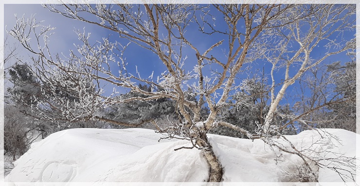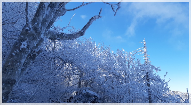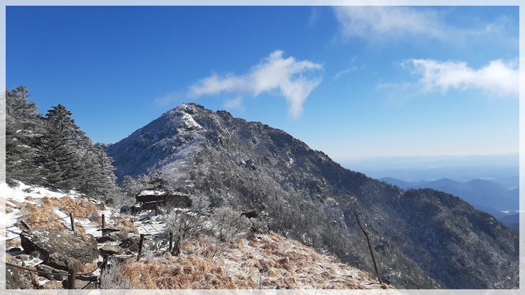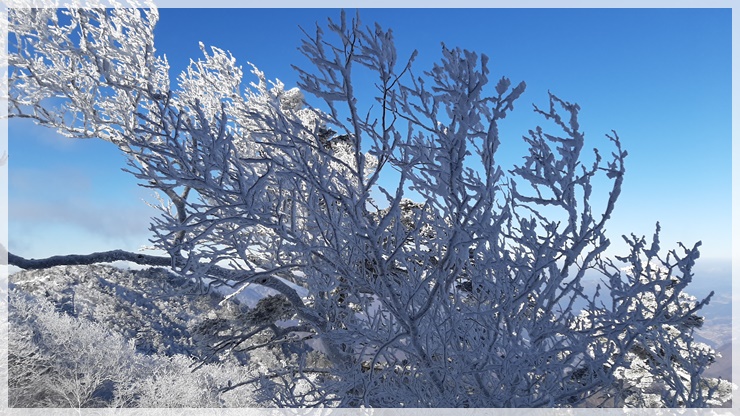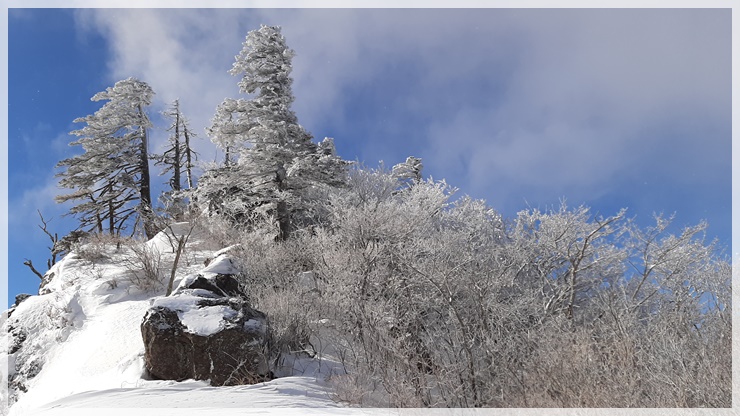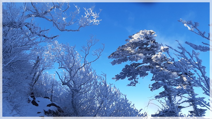 천왕봉 정상 칼바람에 뽈때기가 떨어져 나갈 것 같아 사진을 찍는 둥 마는 둥 하고 후다닥 장터목 방향으로 발걸음을 옮겼습니다. 정상 바로 아래 내려서니 정상에서는 그토록 세차게 불던 바람이 바위언덕에 막혀 생각보다 따뜻합니다. 천왕봉에서 장터목대피소까지의 등로에서는 하얀 겨울 경치에 앙코가 정신을 못 차립니다. 손이 시린 줄도 모르고 사진 찍기에 바쁩니다. 겨울 지리에 올라 보지 않은 사람은 도저히 누릴 수 없는 눈 호강입니다. 이래서 추위를 마다하고 지리를 찾는 것입니다.