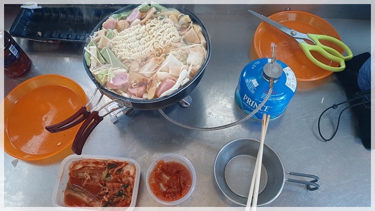 장터목대피소에서 만찬을 끝내고 커피한잔 하는데 뜻밖에도 산타나가 『상조성』하며 내 이름을 부릅니다. 한때 9정맥 길을 같이하면서 마음을 맞추며 무던히도 함께 산행을 했는데 최근 코로나로 인해 산행이 뜸해지면서 얼굴본지가 오래 되었는데 오늘 장터목에서 만나니 너무너무 반갑습니다. 아마도 산타나와 텔레파시가 뿅 통해버렸나 봅니다. 오래간만에 장터목에서 밀린 회포를 풀고 중산리 방향으로 하산을 서둘렀습니다.