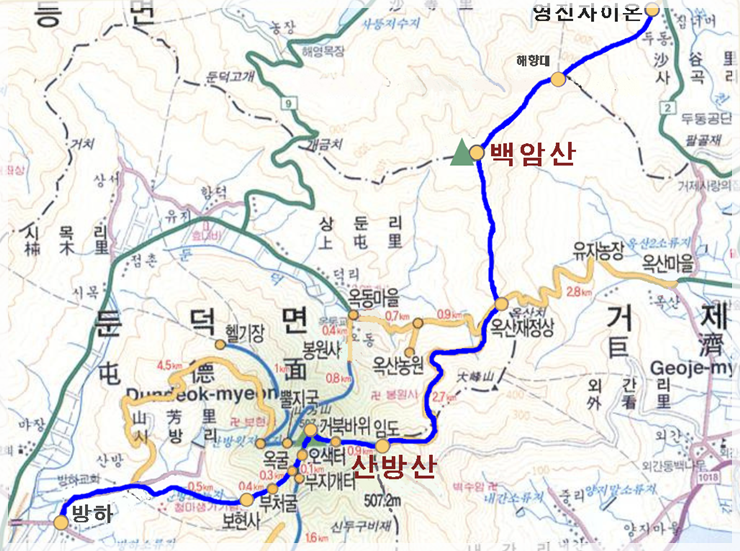□ 산행 여정 : 영진자이온→해향대→백암산→옥산재→산방산→보현사→방하마을