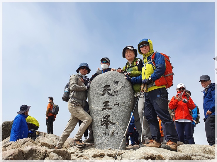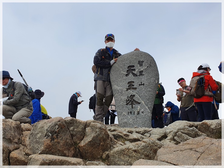 천왕봉 정상에 사진 찍겠다는 산님들로 긴 줄이 형성되어 있습니다. 우리 일행들의 차례가 올 때까지 앙코가 모든 사람들의 사진을 원 없이 모두 찍어 주었습니다. 그러니까 차례가 엄청 빨리 왔습니다.