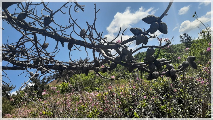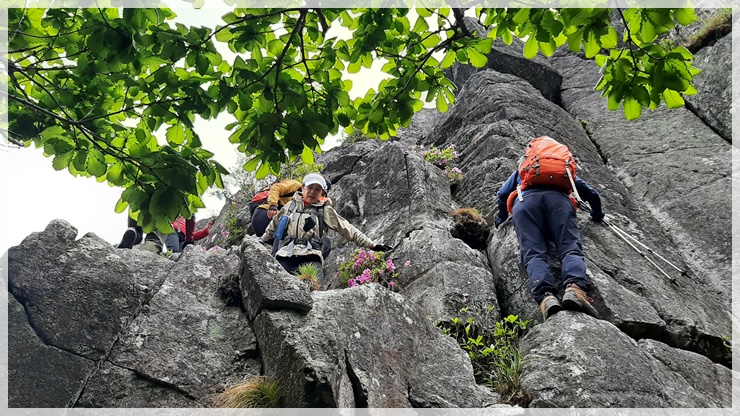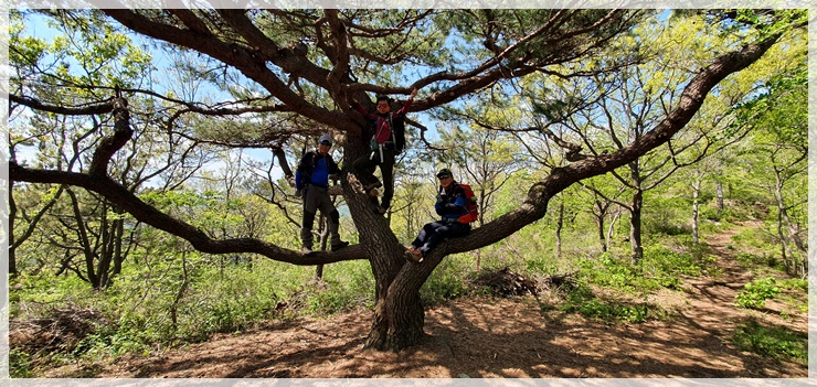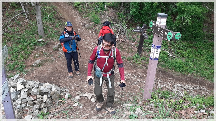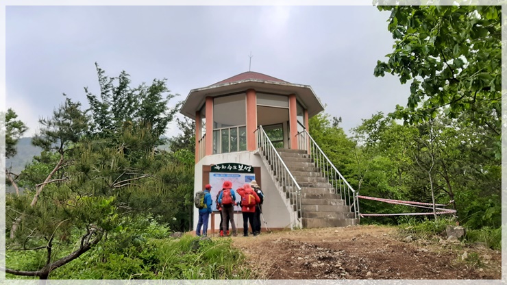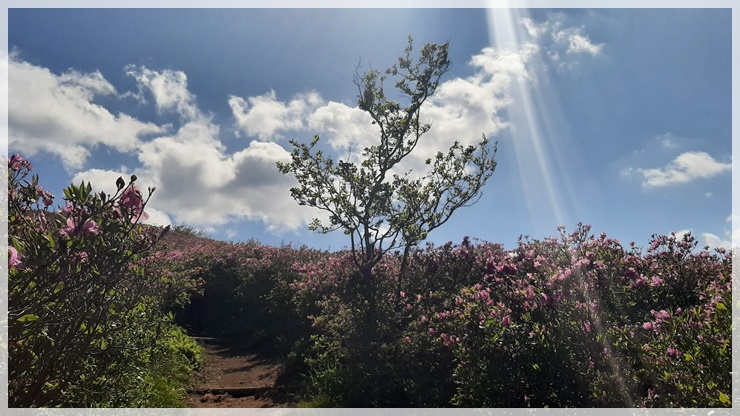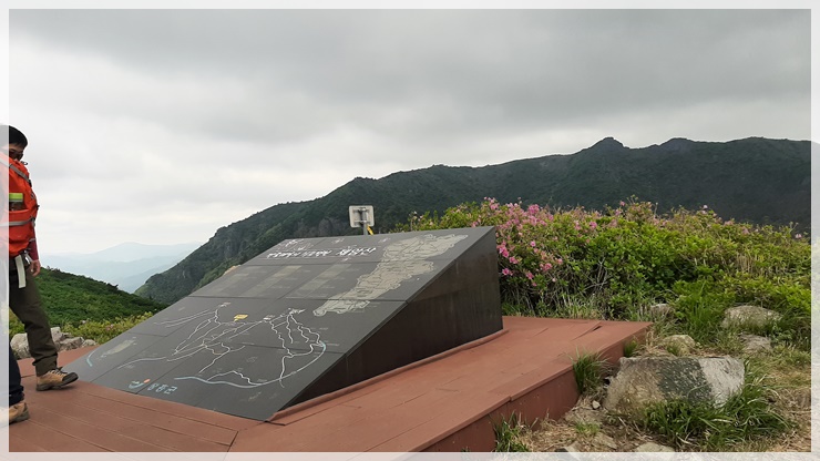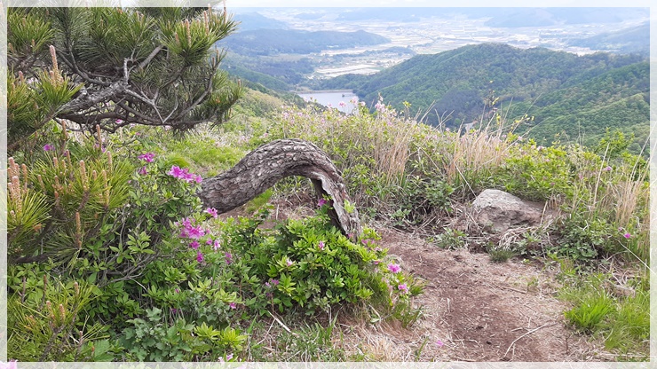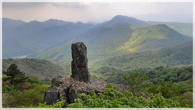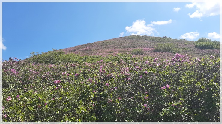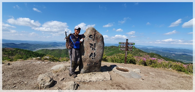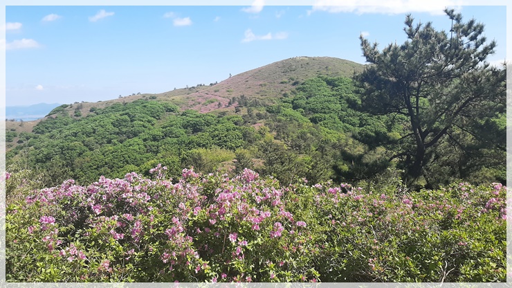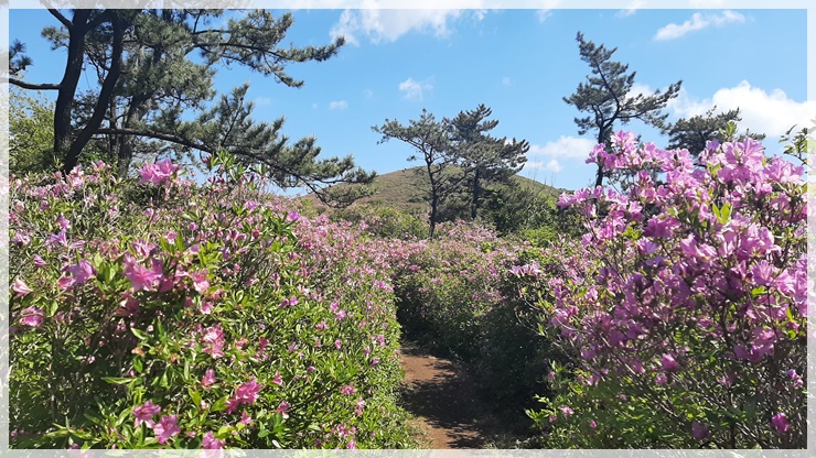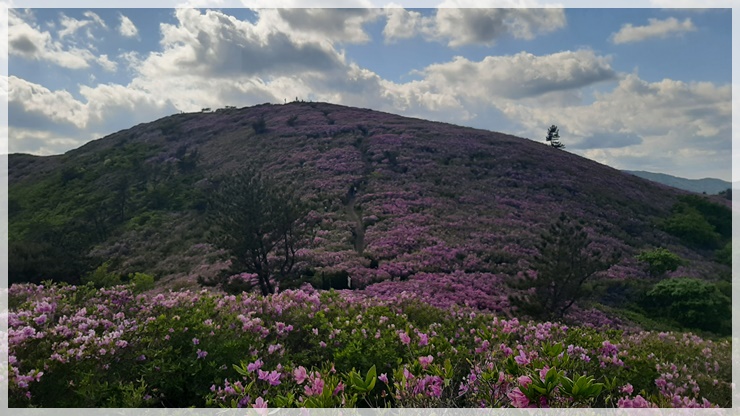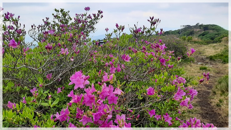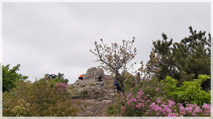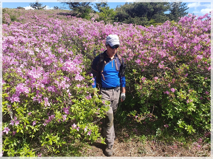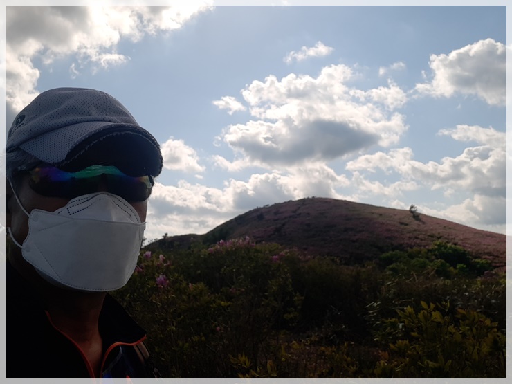 예년 같았으면 철쭉동산에서 철쭉 축제가 펼쳐졌을 것인데 그 놈의 코로나 땜새 행사는 취소되고 산님들의 발걸음마저 뜸해 너무 조용합니다. 이어지는 능선에는 띄엄띄엄 철축꽃이 피어 있어 작은 즐거움은 있습니다. 사자봉은 사자의 몸통이랍니다. 오리지널 사자 머리봉은 몸통에서 왕복 4Km 거리라 일림산으로 가야 할 산행시간을 감안하여 포기하기로 하였습니다.