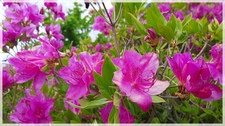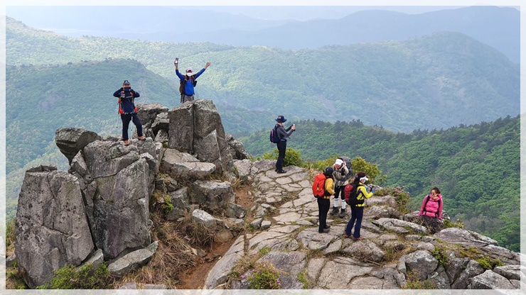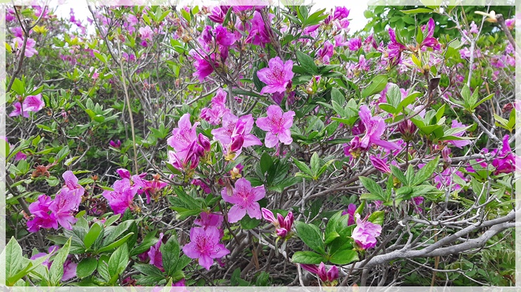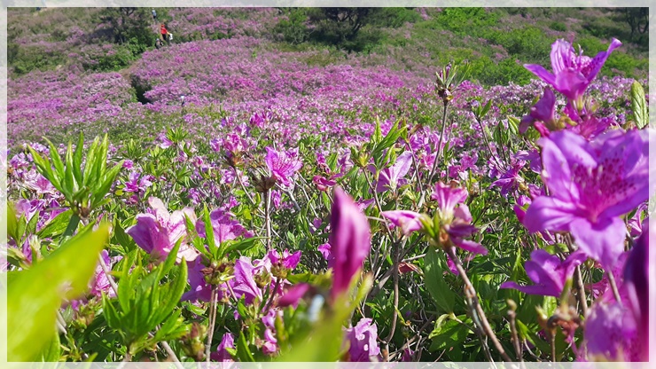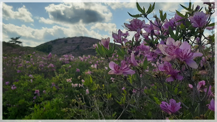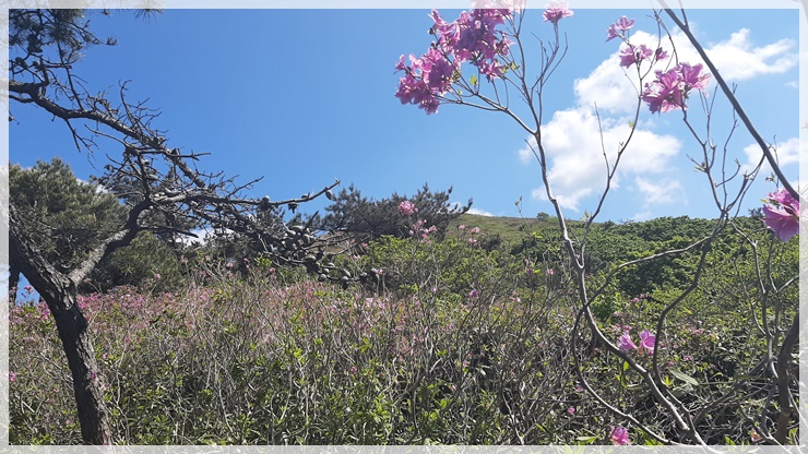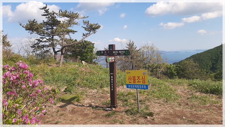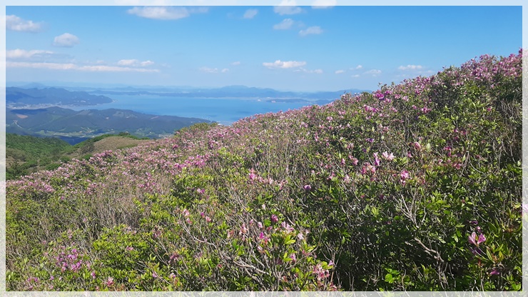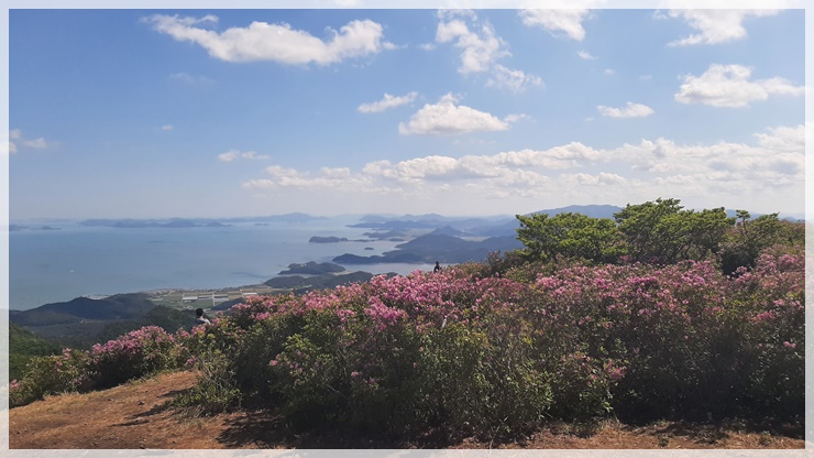 일림산 정상에 올라섰습니다. 사방 온 산이 철쭉꽃의 향연이며 득량만의 오밀조밀 섬들과 푸른 바다가 어울린 조망이 압권입니다. 익히 이전에 초암산 철쭉을 보았고 이곳 바래봉, 매화산 철쭉도 보았지만 오늘의 일림산 철쭉은 그 중 압권입니다. 한참 동안 일림 철쭉을 즐겼습니다. 철쭉 최곱니다.