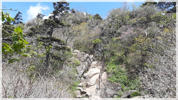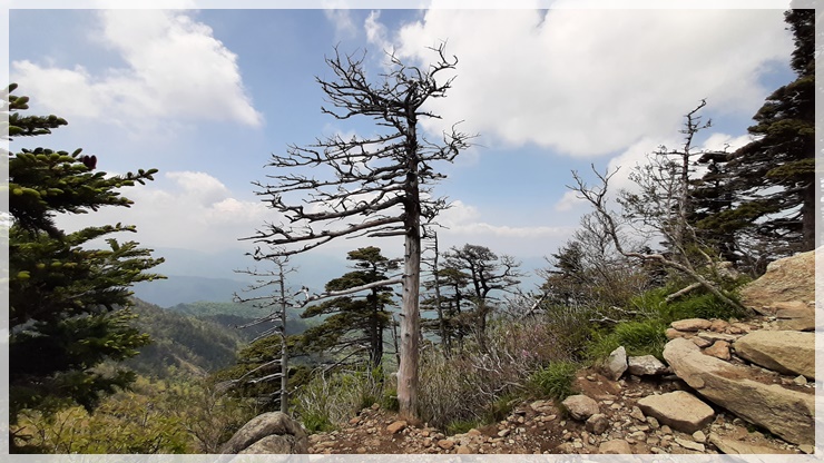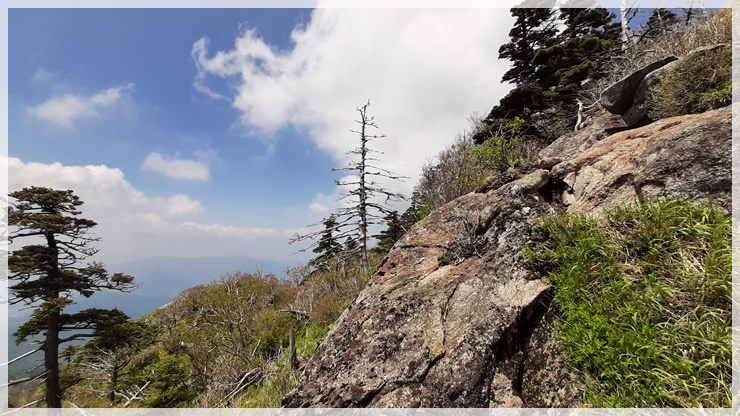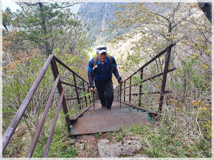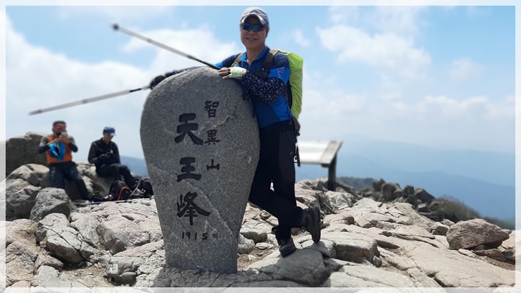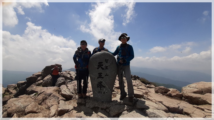 3츨폭포를 지나 계곡 너덜지대에서 이른 점심식사를 하고 마폭포까지 한달음에 올랐으며 빈 물통에 물을 가득 채웁니다. 마폭포에서 천왕봉까지는 급경사 길이며 별도의 국공 안내가 없으니 산행자 각 개인의 체력에 맞춰가며 올라야 합니다. 오르다 쉬다를 여러 차례 천왕봉 바로 아래 철 계단을 만납니다. 3년전 양다리 쥐가 내려 옴짝달싹도 못해 계단 6개를 남기고 그 자리에 주저앉아 버렸던 철 계단을 이번에는 거뜬히 치고 올라섰습니다.