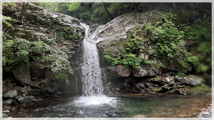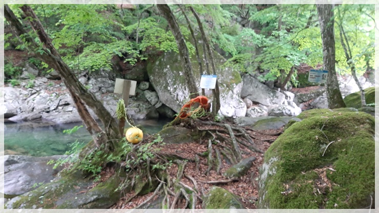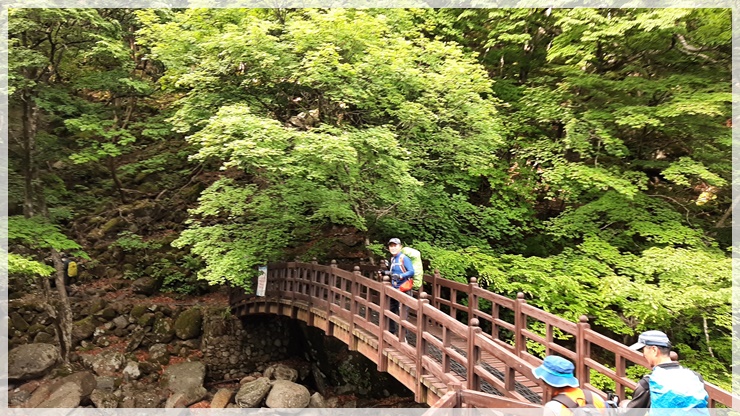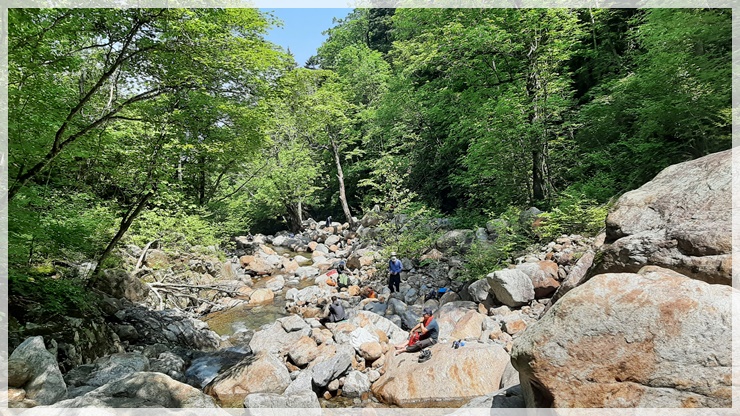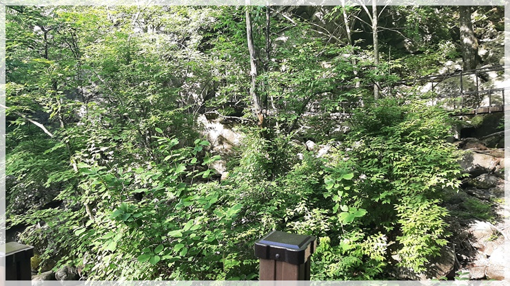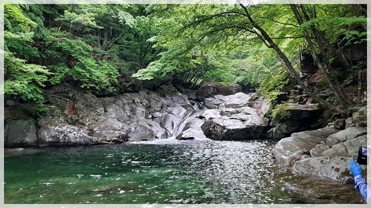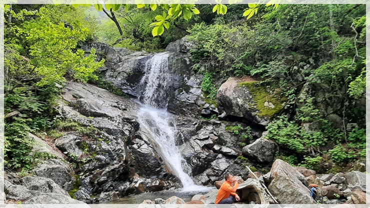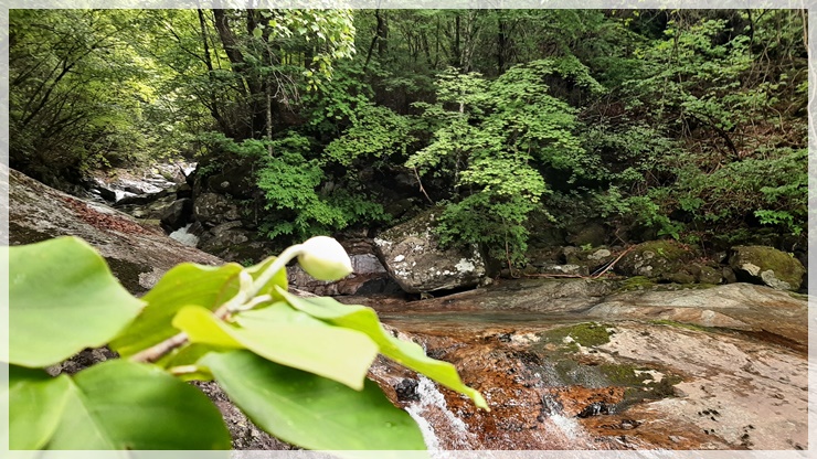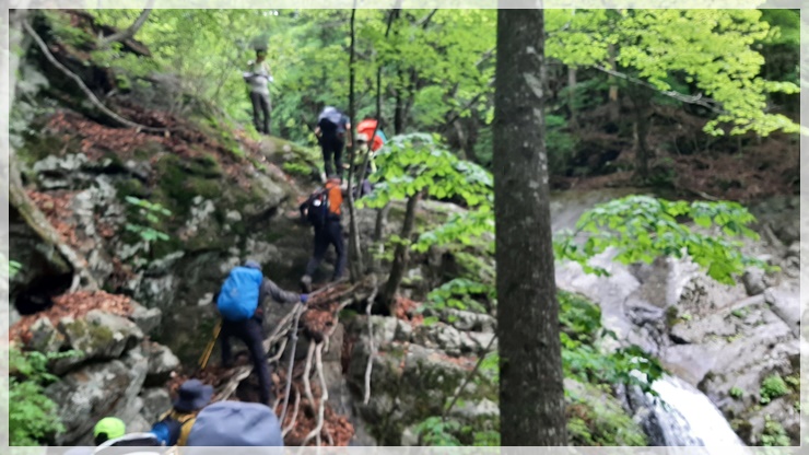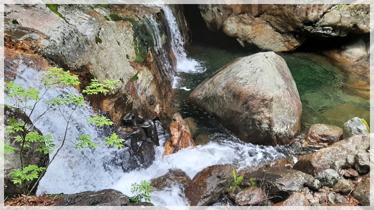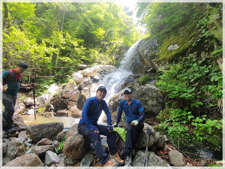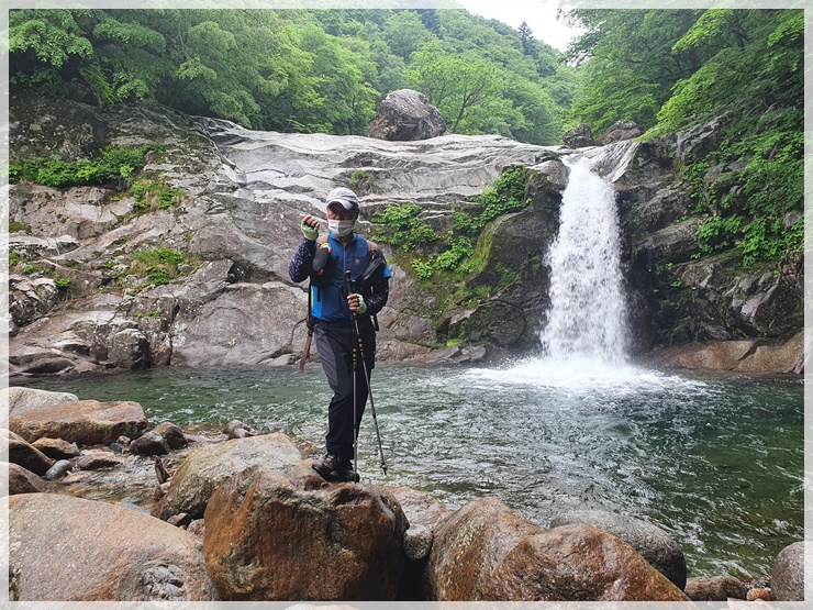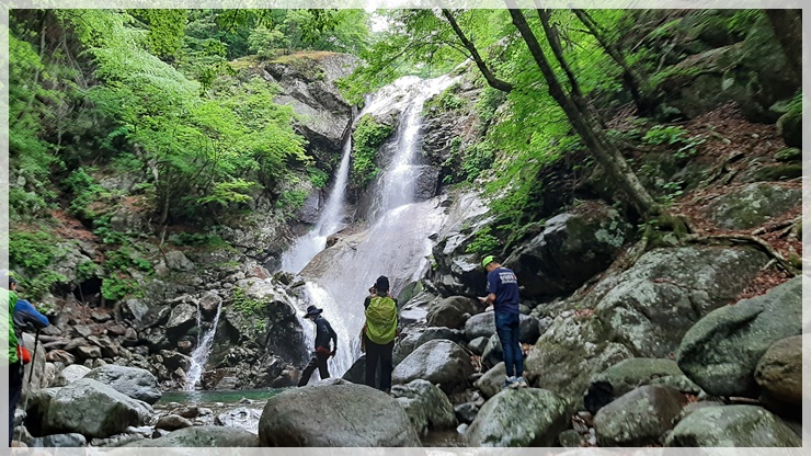 예전 선조께서 비바람을 피해가며 박달나무 목기를 깎았다는 청춘홀이라는 바위굴 옆을 지납니다. 칠선폭포, 대륙폭포 그리고 삼층폭포를 지나는 동안 계곡을 여러 번 왔다 갔다 건너야 해 안내원 없이 가다간 길을 잃기 십상이며 가끔 로프를 잡아야 하는 위험구간도 있어 안내산행이 당연하다 생각되며 사람들의 발걸음을 받지 않은 원시계곡의 바위 이끼는 너무 미끄러워 위험천만이라 세심한 주의를 요합니다.