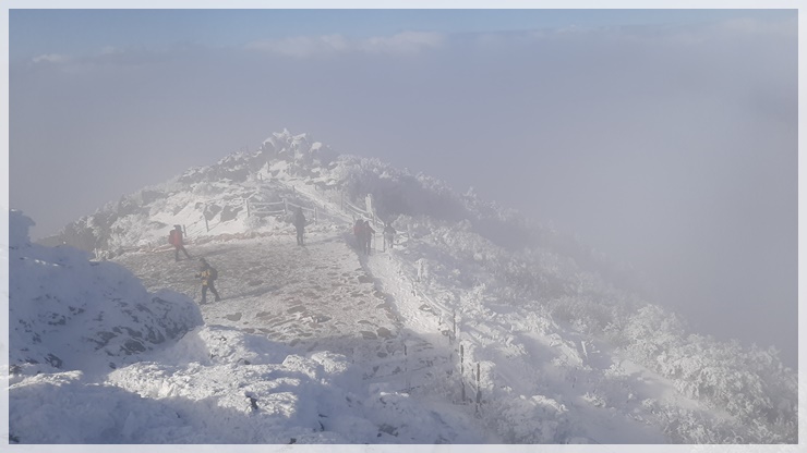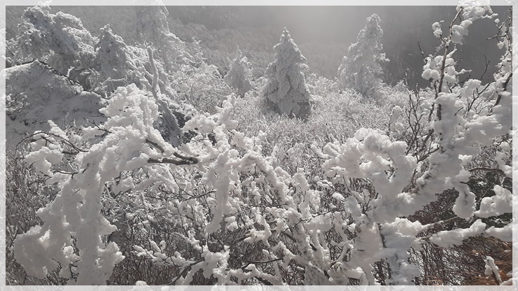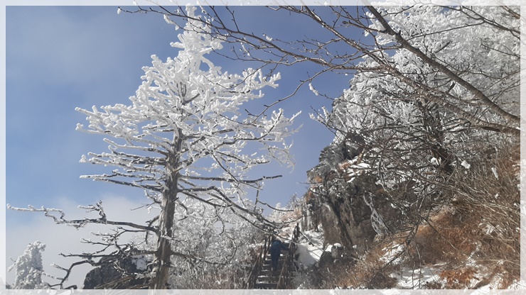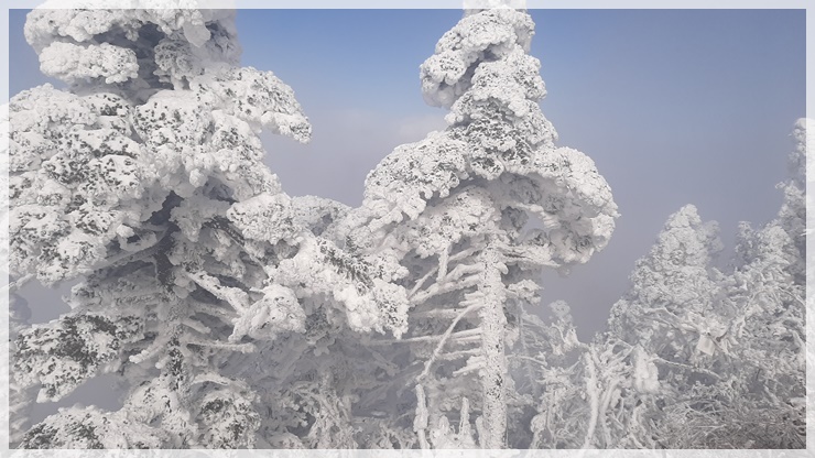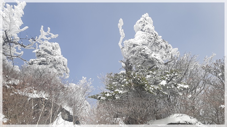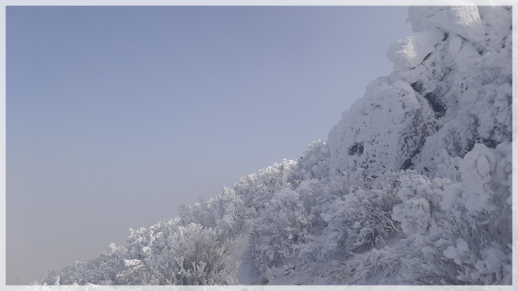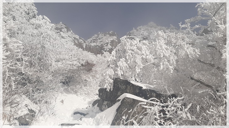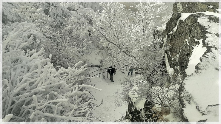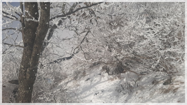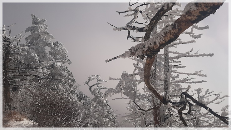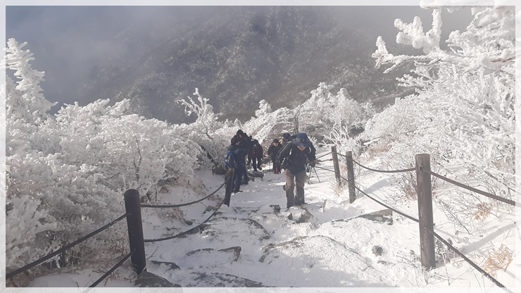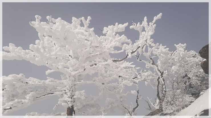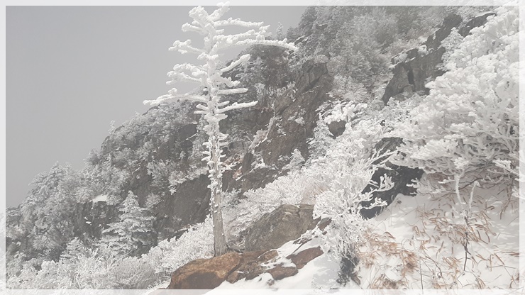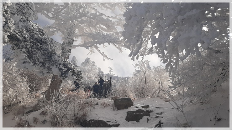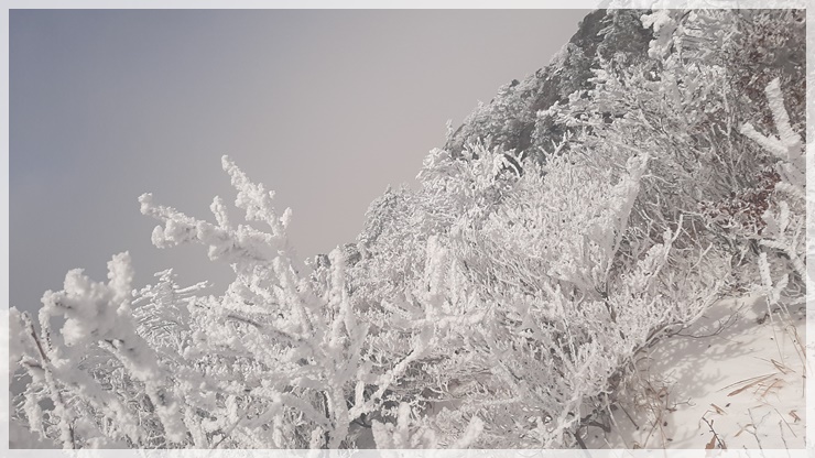 로타리대피소 잠깐 지나 아이젠을 착용했습니다. 눈 산행을 예상하지 못했던 산님들이 엄청 고생을 하고 있습니다. 개선문 언저리쯤에 상고대가 매달렸고 눈꽃도 피었습니다. 천왕샘 근처의 나무들은 눈 모자와 북유럽풍 나뭇가지에 목화솜 같은 새하얀 꽃을 피웠습니다. 올 들어 처음 내린 눈이라서 그런지 유난히 부드럽고 청결했습니다.