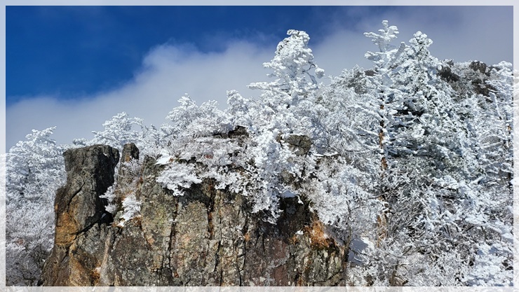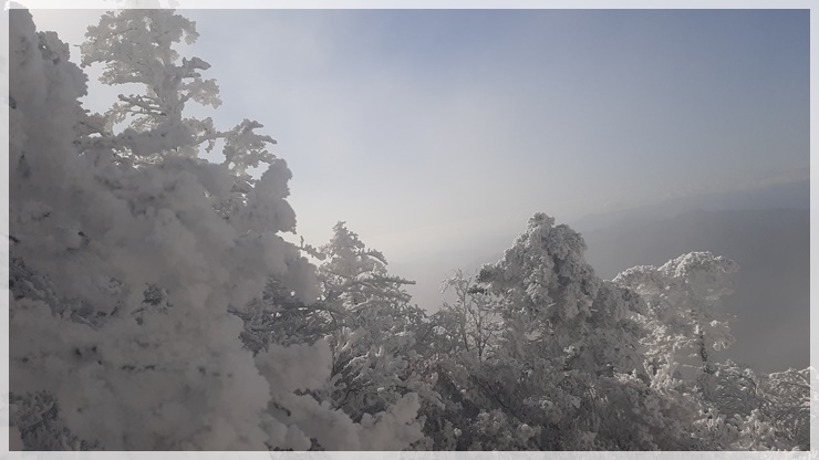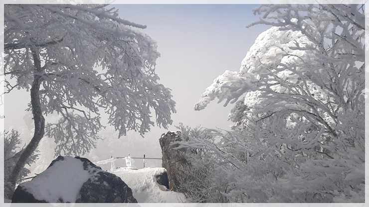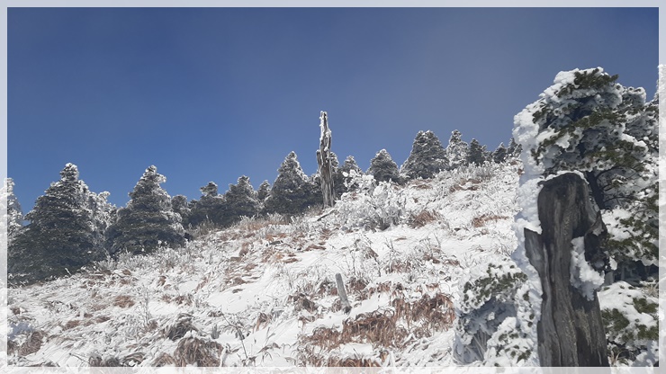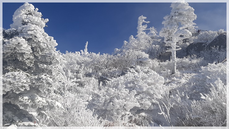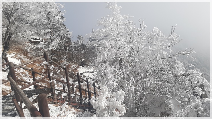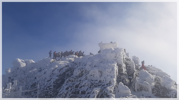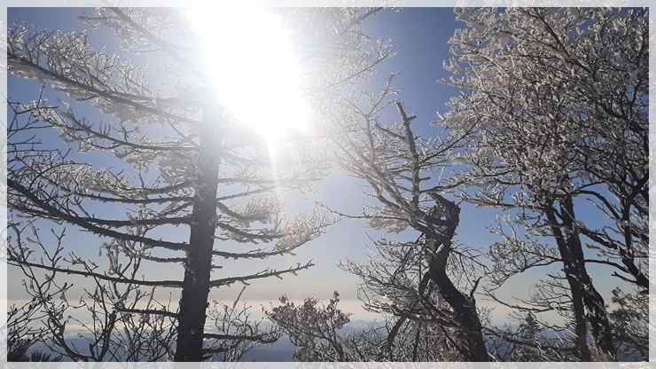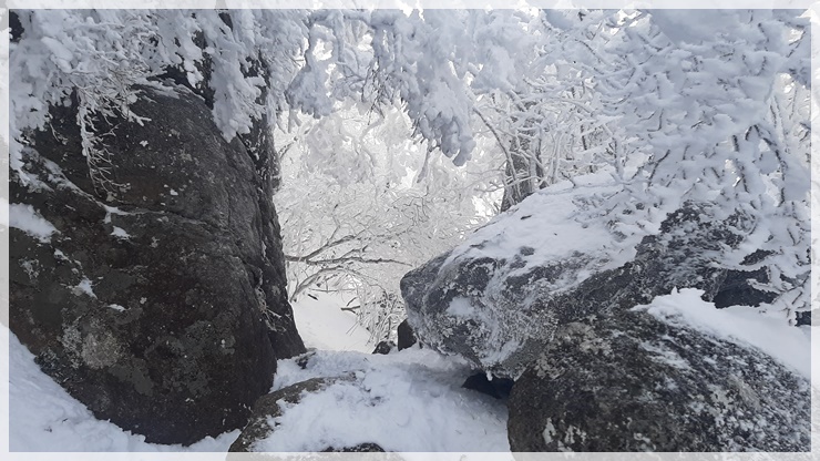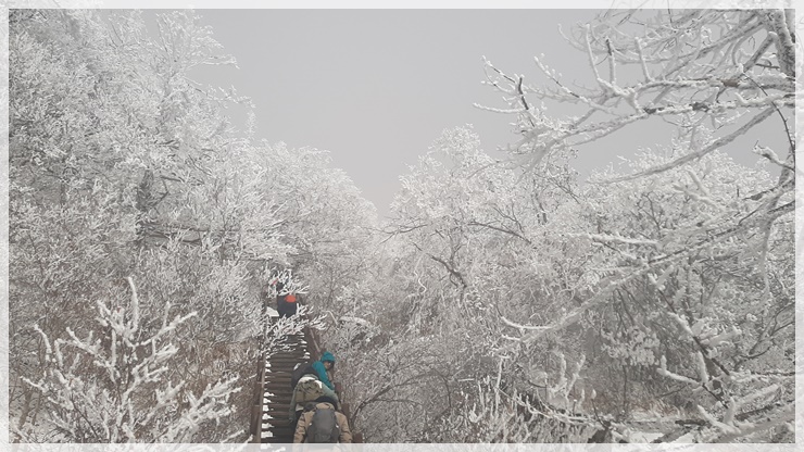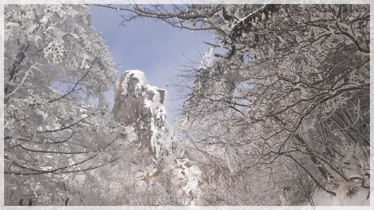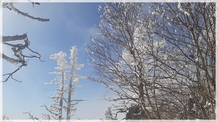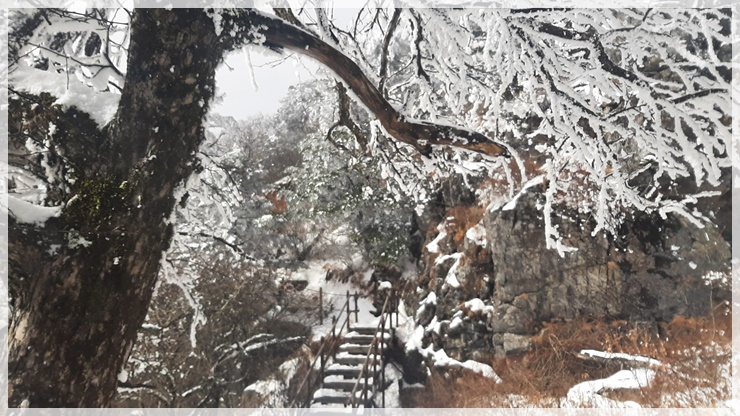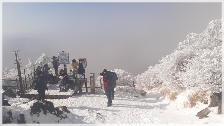 로타리대피소 잠깐 지나 아이젠을 착용했습니다. 눈 산행을 예상하지 못했던 산님들이 엄청 고생을 하고 있습니다. 개선문 언저리쯤에 상고대가 매달렸고 눈꽃도 피었습니다. 천왕샘 근처의 나무들은 눈 모자와 북유럽풍 나뭇가지에 목화솜 같은 새하얀 꽃을 피웠습니다. 올 들어 처음 내린 눈이라서 그런지 유난히 부드럽고 청결했습니다.