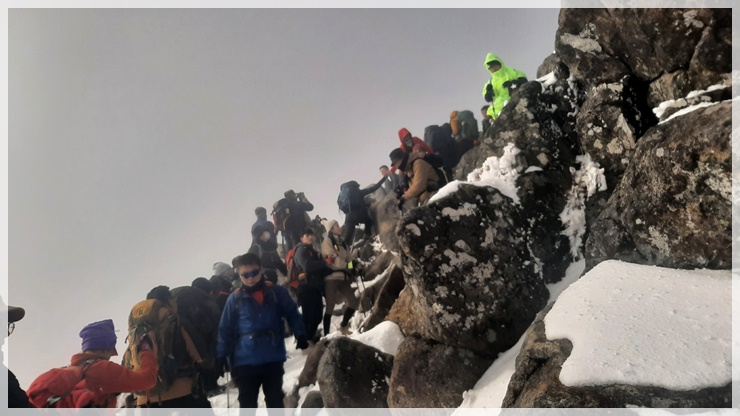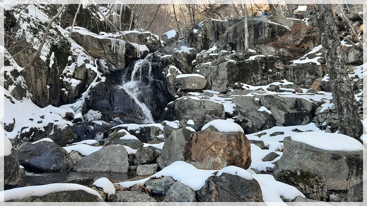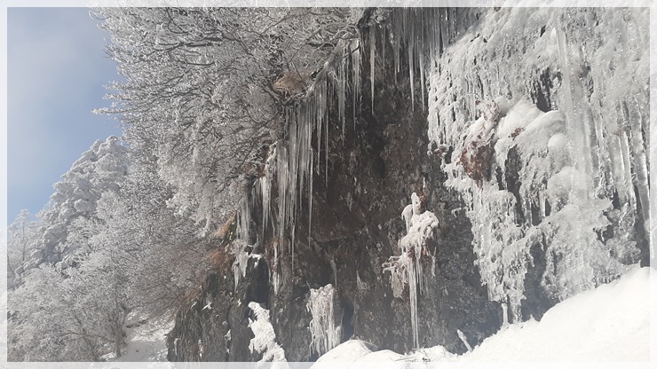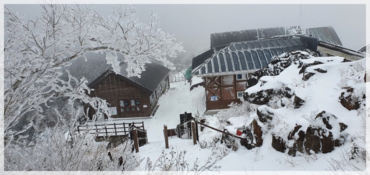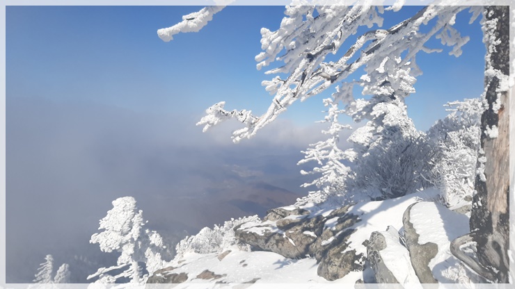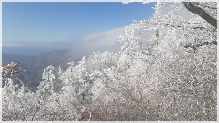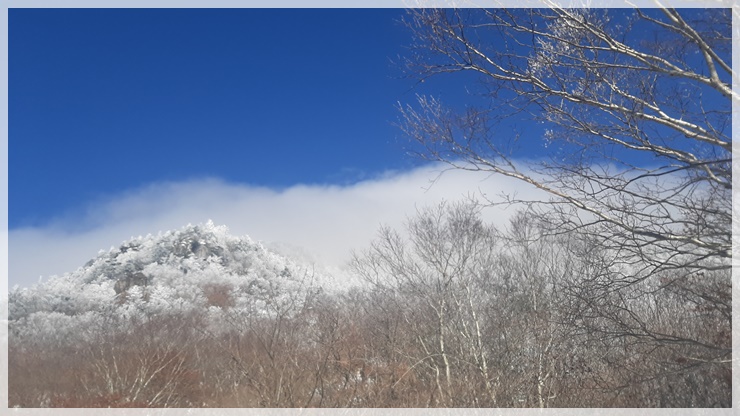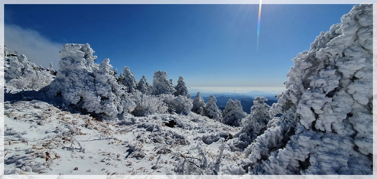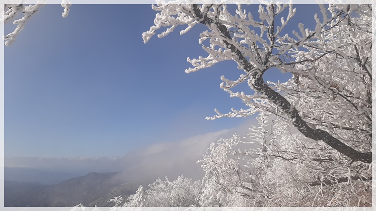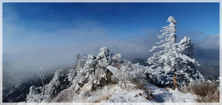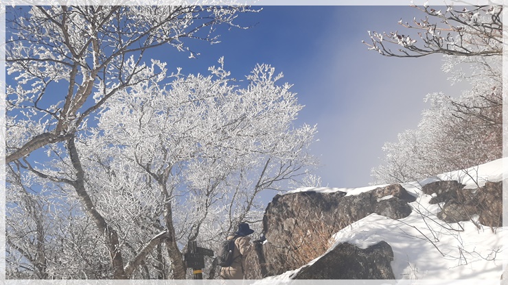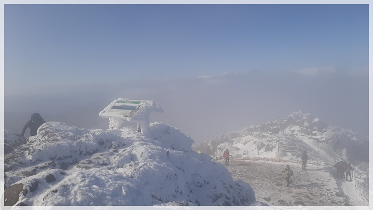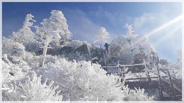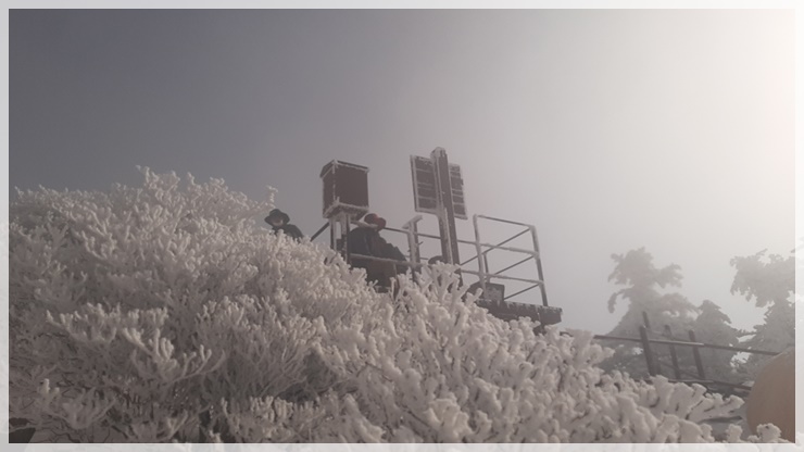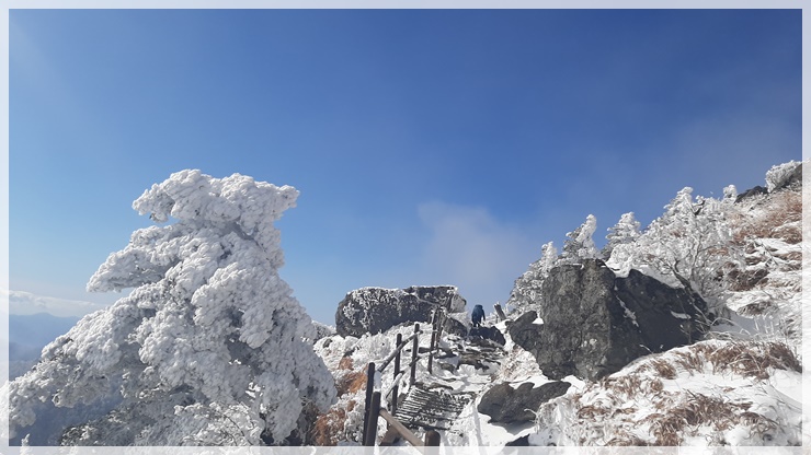 로타리대피소 잠깐 지나 아이젠을 착용했습니다. 눈 산행을 예상하지 못했던 산님들이 엄청 고생을 하고 있습니다. 개선문 언저리쯤에 상고대가 매달렸고 눈꽃도 피었습니다. 천왕샘 근처의 나무들은 눈 모자와 북유럽풍 나뭇가지에 목화솜 같은 새하얀 꽃을 피웠습니다. 올 들어 처음 내린 눈이라서 그런지 유난히 부드럽고 청결했습니다.