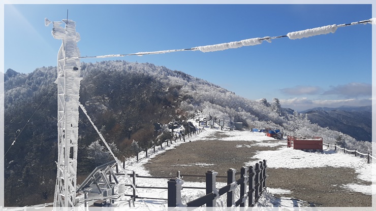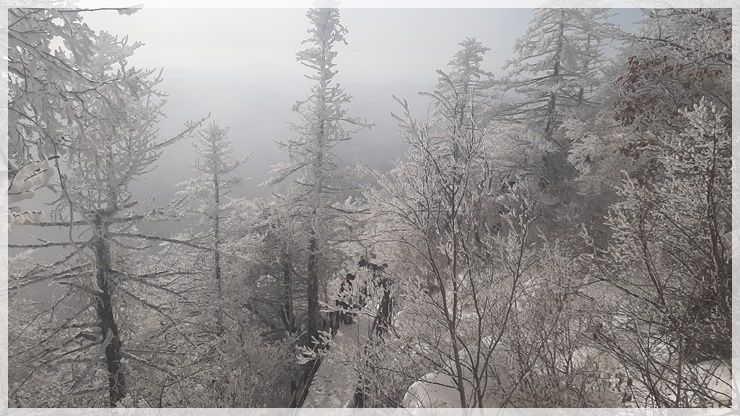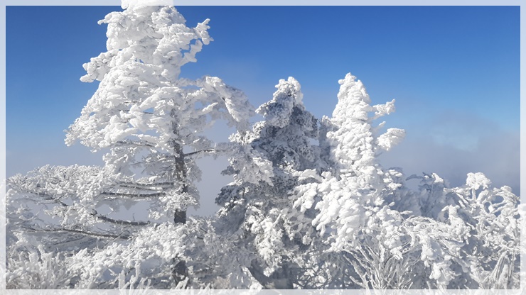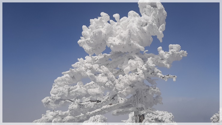 로타리대피소 잠깐 지나 아이젠을 착용했습니다. 눈 산행을 예상하지 못했던 산님들이 엄청 고생을 하고 있습니다. 개선문 언저리쯤에 상고대가 매달렸고 눈꽃도 피었습니다. 천왕샘 근처의 나무들은 눈 모자와 북유럽풍 나뭇가지에 목화솜 같은 새하얀 꽃을 피웠습니다. 올 들어 처음 내린 눈이라서 그런지 유난히 부드럽고 청결했습니다.