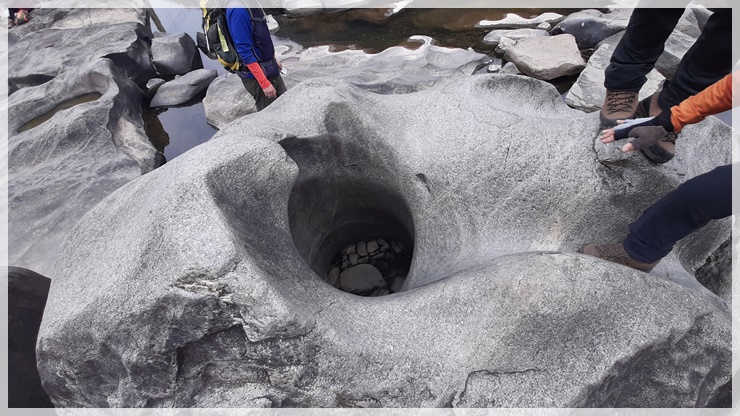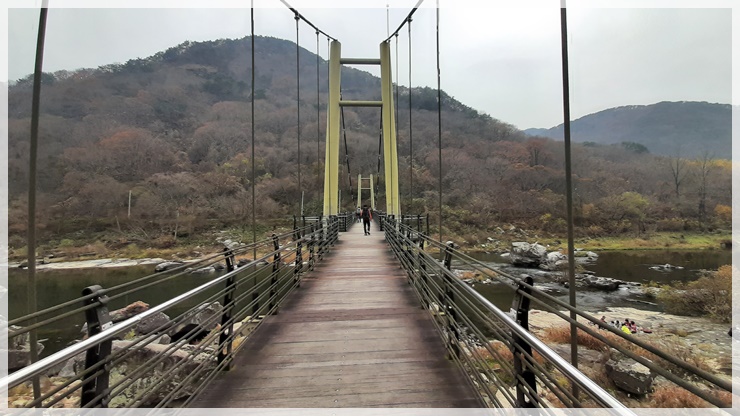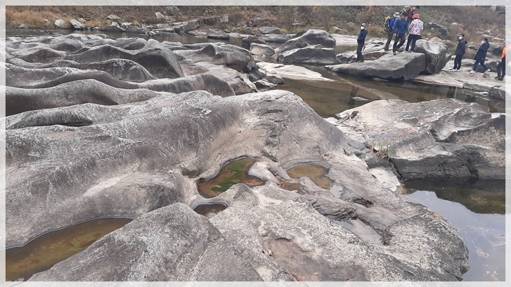 내룡재부터 내룡마을까지는 임도길입니다. 내룡마을 앞 섬진강에 울렁불렁 신기한 바위가 널려있는 장군목이 있습니다. 사람 두어 명이 들어갈 수 있는 크기의 움푹 파진 요강바위 속에 들어가 봤습니다. 6.25사변때 마을주민 몇 명이 이 요강바위에 숨어들어 목숨을 건졌다는 믿거나 말거나 하는 구전도 전해옵니다. 장군목 현수교를 건너 섬진강 자전거 종주길을 따라 마실휴양시설까지 내려감으로써 용궐산 산행을 마무리하고 이어서 진행할 채궐산의 무량사주차장 입구로 이동했습니다.