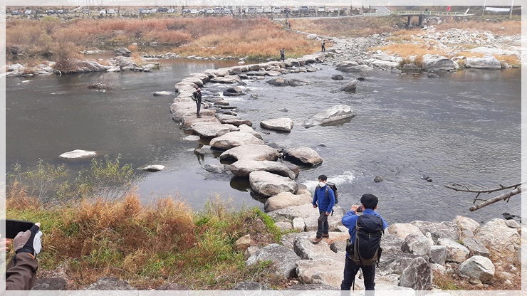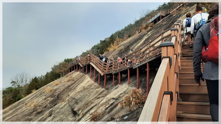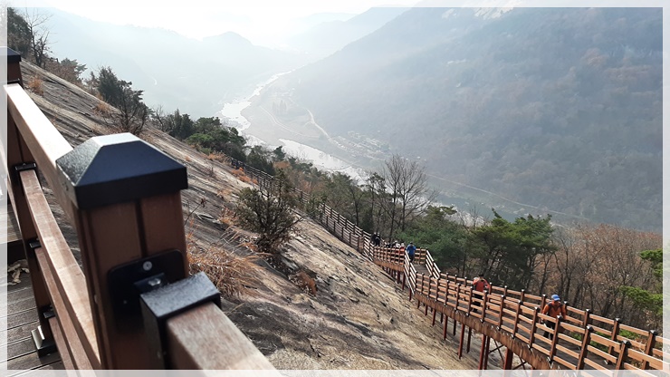 섬진강 자전거 종주길의 마실휴양숙박시설 앞에 미니버스 한려가 도착하고 섬진강 건너편 용궐산의 거대한 바위 허리에 중국의 잔도 같은 아슬아슬한 길이 보입니다. 그곳이 이름하여 하늘길이며 우리가 지나갈 길이랍니다. 섬진강 징검다리를 건너 용궐산 초입으로 들어서니 가파른 돌계단 길이 기다리고 있고 하늘길을 찾아 오르는 수많은 인파로 산행 진행에 어려움이 있습니다.