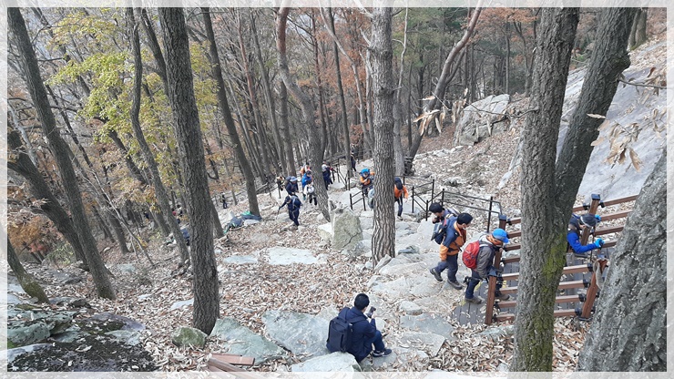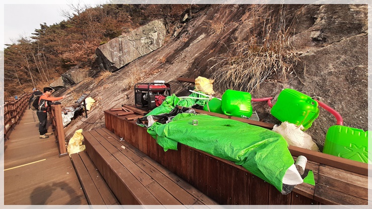 하늘길? 왜? 이렇게 멋지고 웅장한 용궐산 암벽에 이런 길을 만들고 있을까요? 용궐산 등로는 사방팔방 널려있어 등산에 아무 지장이 없으며 암벽 그 자체를 쳐다보는 것만으로도 순창의 관광명소로 충분하건만 암벽을 굳이 훼손시켜가며 거기에 길을 만들 필요가 있는지 앙코는 도저히 모르겠습니다. 인간들의 얄팍한 셈법에 의해 파괴된 자연은 영원히 되돌릴 수 없을 것이라 생각하니 가슴이 아립니다. 이런 하늘길은 한번의 눈요기 감은 될 수 있을지 몰라도 미래를 보아서는 전혀 도움되지 않는 무의미한 자연파괴라고 생각됩니다.