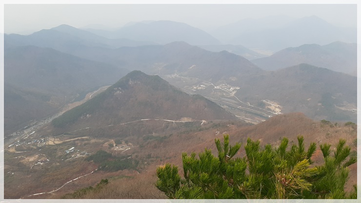 오히려 하늘길이라는 그곳을 지나 능선을 타고 오르는 산행이 더 재미 있습니다. 용궐산 정상에 무슨 한자체인지 알 수 없는 꼬불꼬불한 한자로 용궐산이라고 표기된 거대한 정상석이 있습니다. 그 너머 다른 작은 정상석이 한 개 더 있습니다. 정상에서 바라보는 구비구비 흐르는 섬진강의 자태가 정말 아름답습니다. 삼형제 바위 전망이 아주 좋다고 산타나가 꼭 들러야 한다는데 가는 날이 장날이라고 오늘은 미세먼지 자욱하여 조망이 완전 꽝입니다.