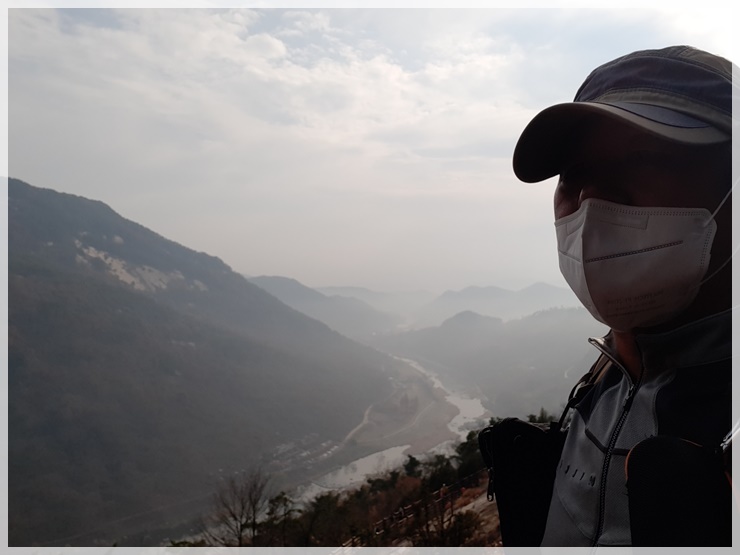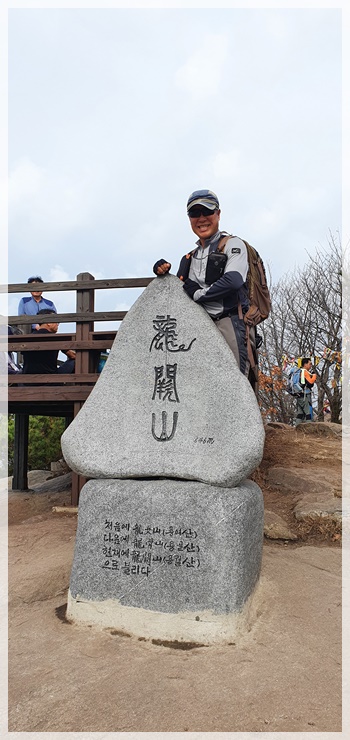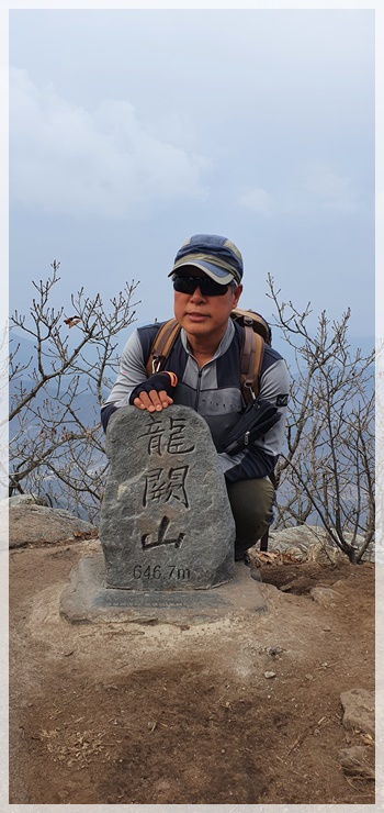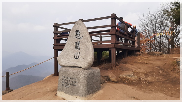 오히려 하늘길이라는 그곳을 지나 능선을 타고 오르는 산행이 더 재미 있습니다. 용궐산 정상에 무슨 한자체인지 알 수 없는 꼬불꼬불한 한자로 용궐산이라고 표기된 거대한 정상석이 있습니다. 그 너머 다른 작은 정상석이 한 개 더 있습니다. 정상에서 바라보는 구비구비 흐르는 섬진강의 자태가 정말 아름답습니다. 삼형제 바위 전망이 아주 좋다고 산타나가 꼭 들러야 한다는데 가는 날이 장날이라고 오늘은 미세먼지 자욱하여 조망이 완전 꽝입니다.