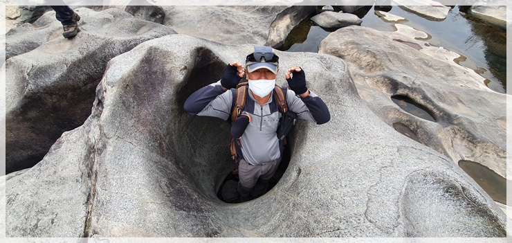 내룡재부터 내룡마을까지는 임도길입니다. 내룡마을 앞 섬진강에 울렁불렁 신기한 바위가 널려있는 장군목이 있습니다. 사람 두어 명이 들어갈 수 있는 크기의 움푹 파진 요강바위 속에 들어가 봤습니다. 6.25사변때 마을주민 몇 명이 이 요강바위에 숨어들어 목숨을 건졌다는 믿거나 말거나 하는 구전도 전해옵니다. 장군목 현수교를 건너 섬진강 자전거 종주길을 따라 마실휴양시설까지 내려감으로써 용궐산 산행을 마무리하고 이어서 진행할 채궐산의 무량사주차장 입구로 이동했습니다.