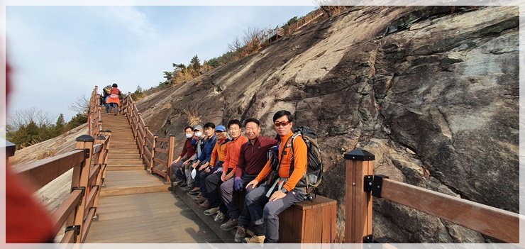 섬진강 자전거 종주길의 마실휴양숙박시설 앞에 미니버스 한려가 도착하고 섬진강 건너편 용궐산의 거대한 바위 허리에 중국의 잔도 같은 아슬아슬한 길이 보입니다. 그곳이 이름하여 하늘길이며 우리가 지나갈 길이랍니다. 섬진강 징검다리를 건너 용궐산 초입으로 들어서니 가파른 돌계단 길이 기다리고 있고 하늘길을 찾아 오르는 수많은 인파로 산행 진행에 어려움이 있습니다.