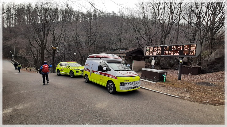장터목대피소에서 잠시 휴식을 취하고 나니 지리산 주능선이 보이지 않을 정도로 미세먼지가 온 하늘을 덮어 버렸습니다. 장터목대피소 바로 아래에서 한 무리의 119 구조대를 만납니다. 부부 산님이 지리를 찾았다가 여성분께서 발목을 접질러 구조대에게 업혀 내려가고 있습니다. 대한민국 응급구조대 정말 고생 많습니다. 유암폭포 아래 돌탑군락지에서 구조헬기를 불러 환자를 태워 보냅니다.