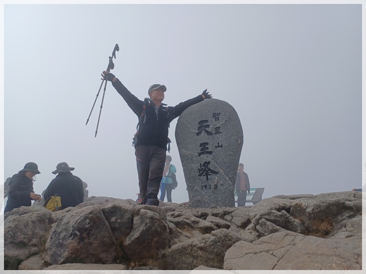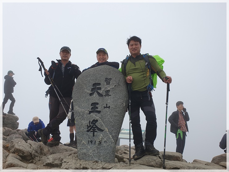 장터목에서 천왕봉까지 역으로 거슬러 올라본 지 오래간만이라 힘들어도 오늘 발걸음도 새로운 맛이 납니다. 제석봉 아름다운 길을 지나 통천문을 통과한 후 거친 호흡을 후후 뿜어대며 천왕봉 오르막길로 올라갑니다. 우리 세 사람 천왕봉 인증을 하고 곧바로 법계사 방향으로 하산입니다.