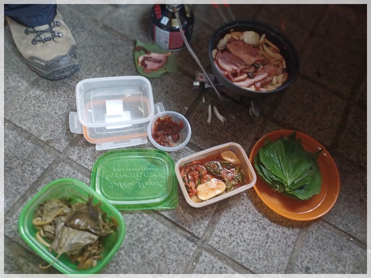 이번에는 갑성의 의견을 받아들여 평소와는 달리 칼바위 삼거리에서 장터목대피소로 올라가기로 합니다. 일기예보의 눈비는 고사하고 날씨가 너무 덥습니다. 갑성은 몸 자체가 물통처럼 수도꼭지를 틀어놓은 듯이 땀이 펑펑 쏟아져 안쓰럽기까지 합니다. 장터목 대피소에 도착하여 일찌감치 만찬 자리를 갖고 보니 복부 포만감으로 천왕봉 오를 일이 부담스럽습니다.