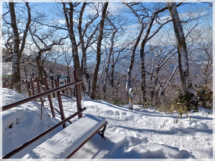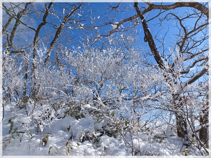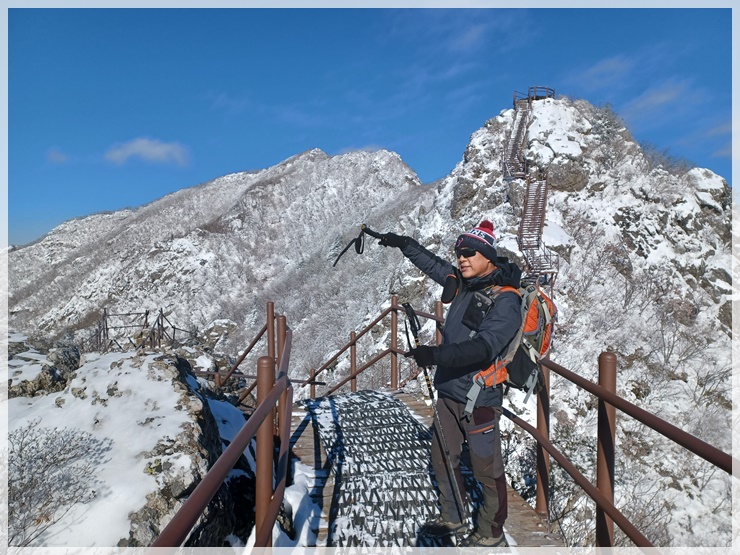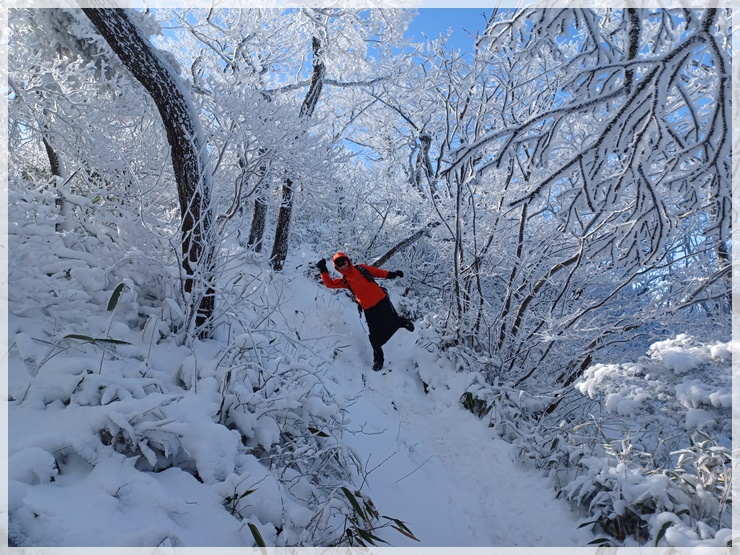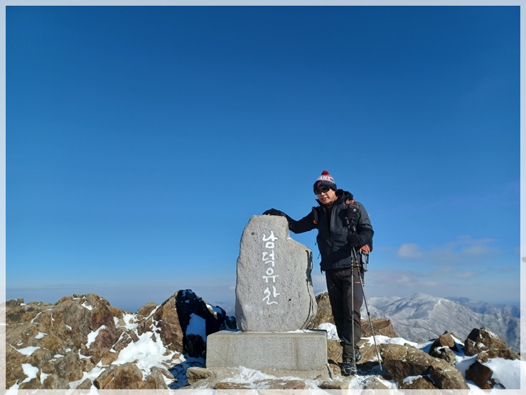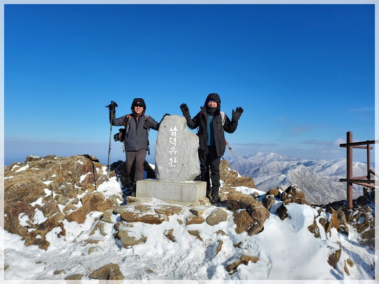 남덕유산 정상은 코발트 블루 하늘과 솜털 눈꽃이 어우러져 안코의 가슴을 뛰게 합니다. 창원에서 홀로 왔다는 사모 한 분이 사진 찍어줄 사람이 없어 애태우다 우릴 보고 엄청 반가워합니다. 거의 대다수 산님들은 서봉을 경유하여 영각사로 원점회귀 하는 산행을 선택하나 갑성과 안코는 삿갓재 대피소로 돌아 황점으로 하산하기로 했습니다. 창원 함사모도 우리 일행을 따르겠다 합니다. 복장상태를 봐서는 약간 염려는 되지만 그러자고 했습니다. 우려와는 달리 날다람쥐 수준이며 우리 덕분에 좋은 경치를 감상한다며 아주 고마워합니다.