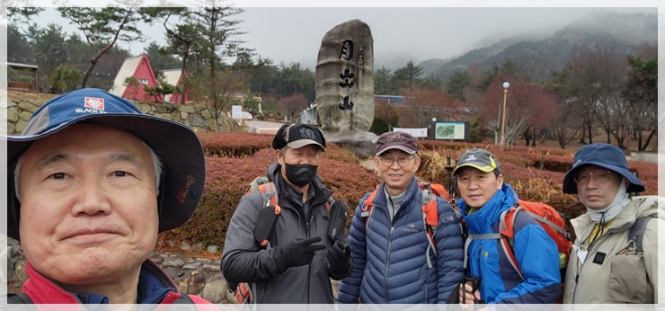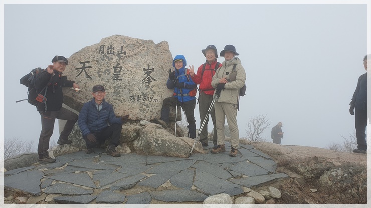 옛날 식구들. 삼중 시절 인연 맺었고 지리산으로 끈끈한 정을 나누고 있는 그런 멤버들이 거제에서 월출산으로 향합니다. 월출산 산행이 끝나면 수년 전 장흥 본가로 귀촌한 위상무님 댁을 위문방문 할 계획도 가지고 있습니다. 토요시장 한라네국밥에서 위상무님을 만났고 아침식사로 소고기국밥 한 그릇 후딱 해치우신 위상무님은 삶은 계란을 전달해 주고 저녁에 먹을 회춘탕에 들어갈 씨암탉을 잡아야 한다며 휑하니 돌아 갔습니다. 우리는 김밥나라 김밥 5줄 준비한 후 천황사주차장을 향해 안개 자욱한 길을 내달렸습니다.