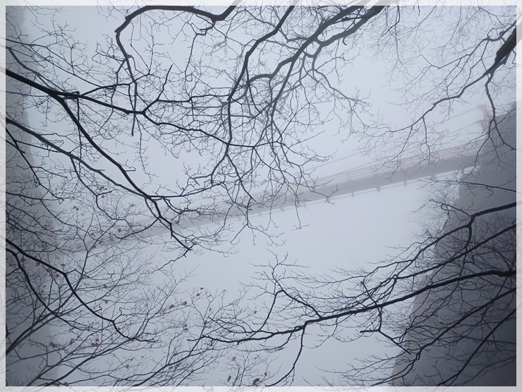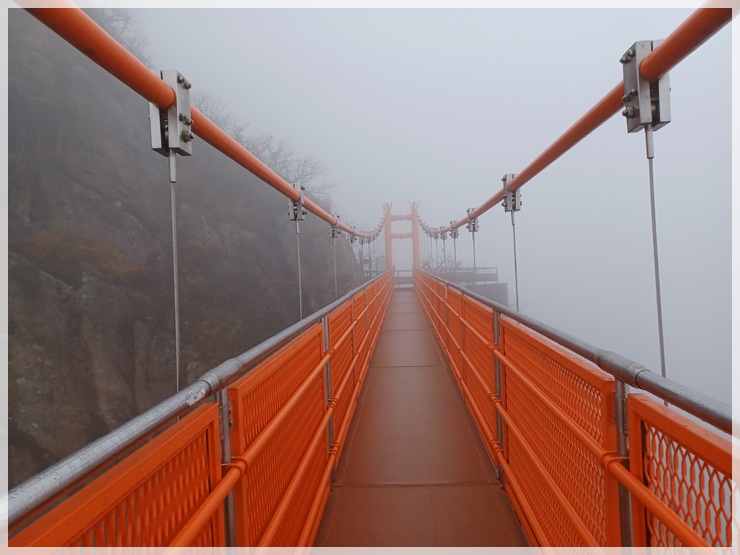 오후에 큰 비가 내릴 것이라는 일기예보 영향인지 월출산 산행 들머리 천황사주차장은 썰렁하고 하늘은 잔뜩 찌푸리고 있습니다. 산행을 시작하여 천황사 갈림길에서 곧바로 바람골 계곡을 통해 가파른 계단을 올라 월출산 명물 구름다리를 건너 매봉, 사자봉을 지나 천황봉 정상으로 가는 코스를 잡고 왔는데 구름다리 건너편에서 출입통제입니다. 곧 바로 BACK 입니다.