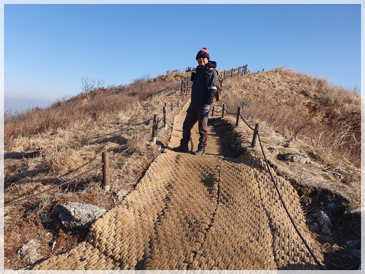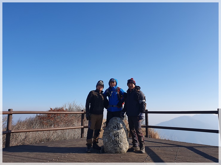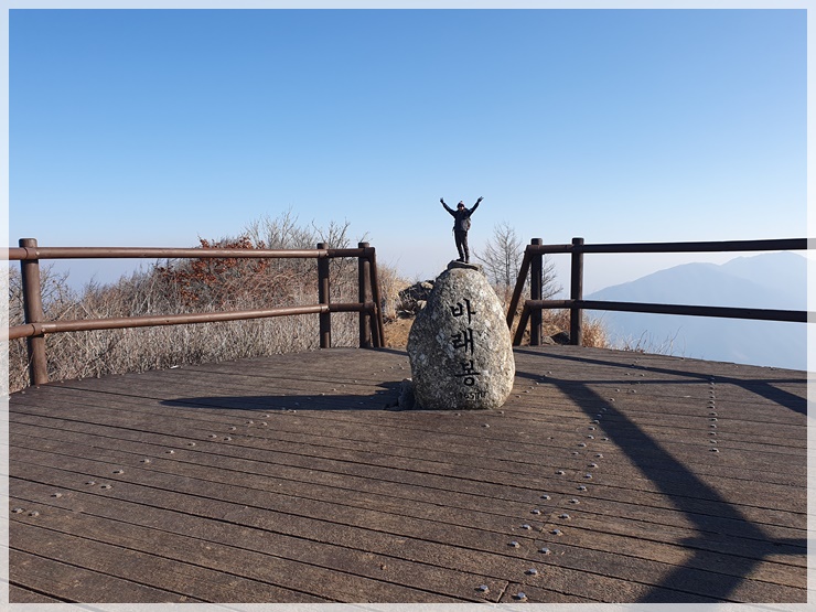 바래봉삼거리 샘터에 들러 물 맛을 보고 바래봉으로 올라갑니다. 겨울이건만 샘물은 그닥 차갑지 않습니다. 바래봉 정상 올라가는 길과 정상은 데크로 형성되어 있습니다. 정상석 보듬고 인증을 한 후 정상석 뒤에 있는 바위에 올라서면 정상석 위에 올라서 있는 형상의 그림이 나오는 포토포인트가 됩니다. 덕규형님이 찍어 준 사진을 확인해 보니 천왕봉 정상석에서 찍었던 사진과 바래봉 정상석이 비슷한 그림이 나옵니다.