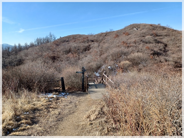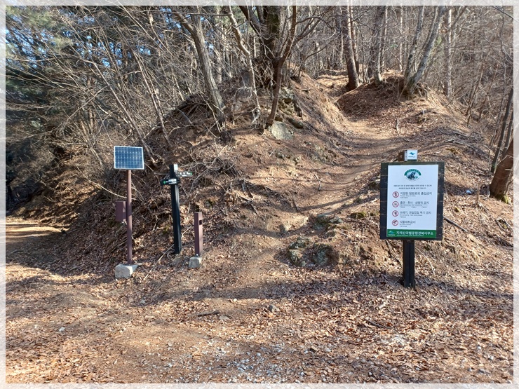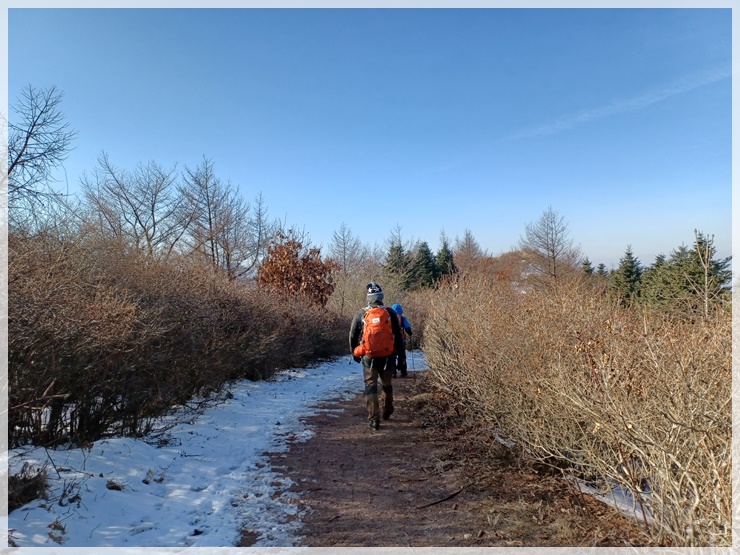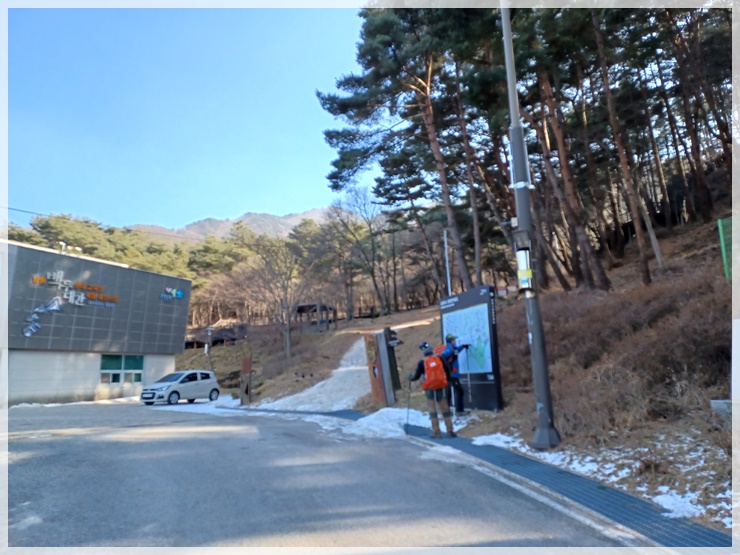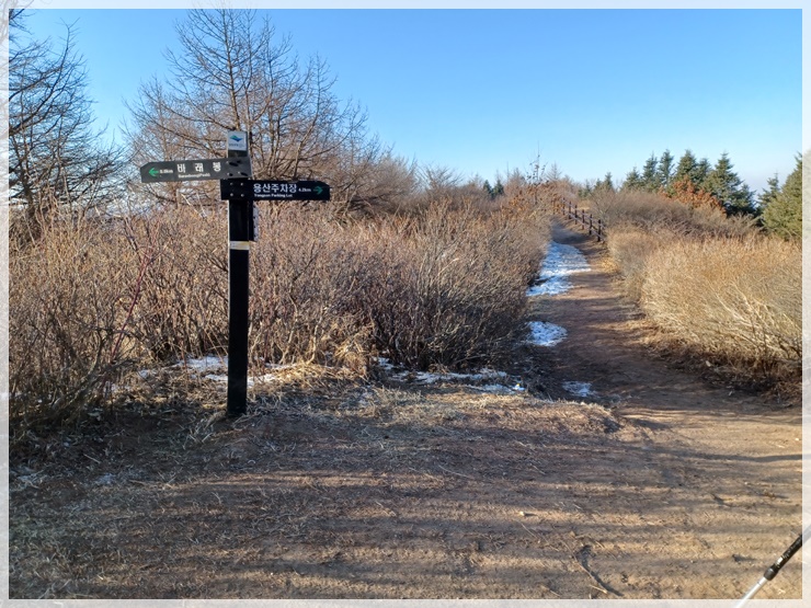 용산재 허브주차장에서 산행 시작 장소가 잘 생각나지 않아 10년 전 고집통 시절 산행기를 둘러보니 지금 안코가 서 있는 이곳이 맞습니다. 눈꽃 축제기간이라는데 눈을 씻고 둘러보아도 눈은 없습니다. 허브주차장을 출발하여 시멘트 길을 따라 올라가니 운지사 삼거리가 나오고 운지사 맞은편 쪽으로 임도를 따라 올라갑니다. 중간 중간 『눈썰매 금지』 위험표지판이 있으나 걱정은 붙들어 매어 놓아도 되겠습니다. 눈이 있어야 눈썰매를 타든 말든 하지요.