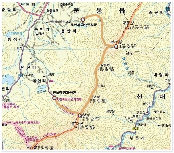 용산재 허브주차장(7:50)→바래봉(9:50)→세동치(13:20)→전북학생교육원(14:30)