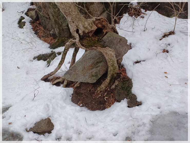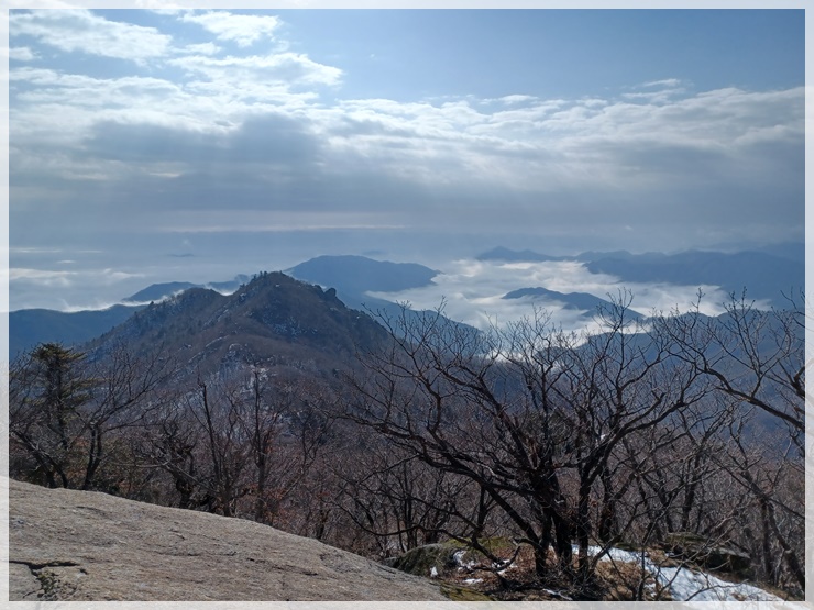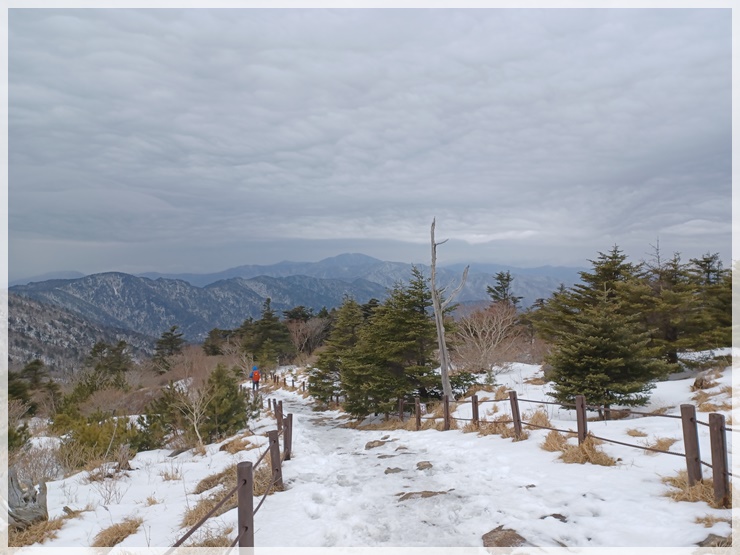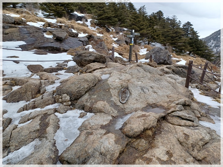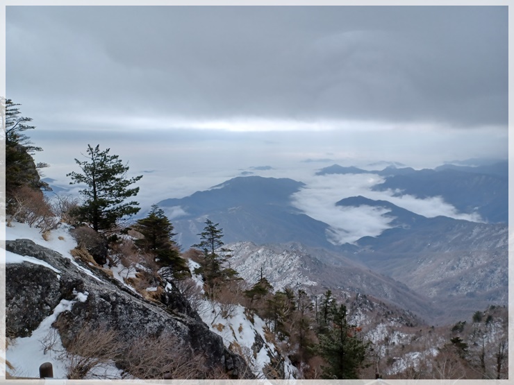 중산리는 비가 오지 않습니다. 망바위 근처에서 뒤돌아보니 중산리계곡에 하얀 구름바다가 형성되어 있습니다. 로타리대피소 근처에서는 따사로운 햇빛이 들기 시작하고 봄님이 오시는지 등로는 눈이 녹아 질척거리고 지난 연말에는 화려했던 천왕샘의 고드름도 사라졌습니다.