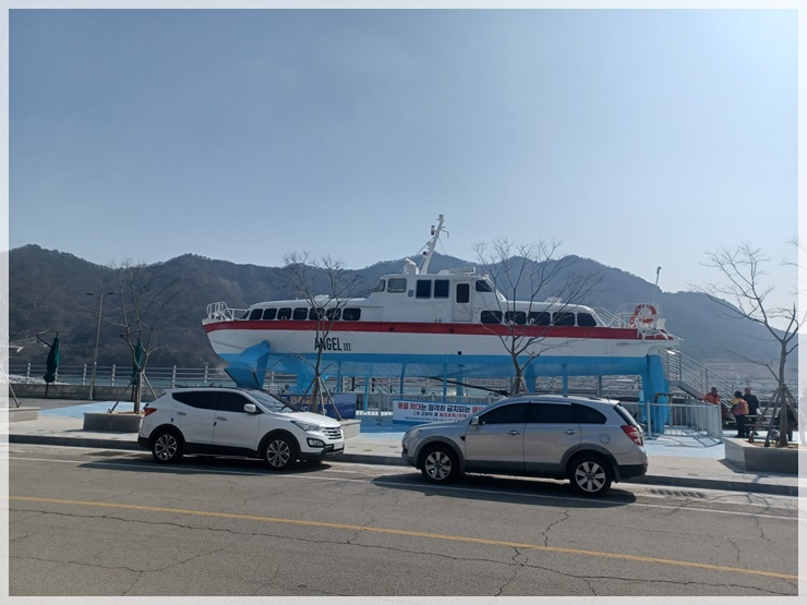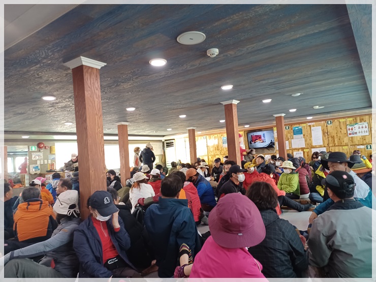 도선 출항과 동시에 따뜻한 마루바닥에 충무김밥 아침식사를 펼쳤습니다. 먼저 승선하여 누워 있던 아지매가 불만 가득한 얼굴에 부르퉁한 목소리로 선내서 취식하면 안 된다고 합니다. 주위를 둘러보니 아닌게 아니라 『선내 취식금지』라는 안내판이 보입니다. 꼭 이런 문구는 누군가에게 한 소리 듣고 나면 눈에 띄게 마련입니다. 잽싸게 음식을 들고 꼭대기 야외 테라스로 이동하여 아침 민생고를 해결했습니다.