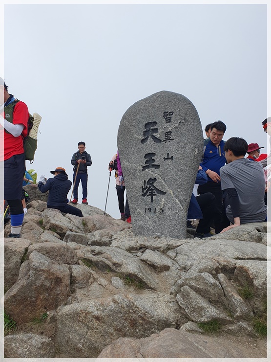 최근 몇 개월간 잠잠하던 쥐라는 놈이 안코의 양다리 허벅지에 또 찾아 왔습니다. 개선문 지나 천왕샘 가기 전 철 계단, 딱 그 자리에서입니다. 안코의 아킬레스인 갑상선 호르몬이 이유일 것이리라 추정은 되지만 지속적으로 관찰하며 관리를 잘해 극복해야 될 일입니다. 휴식과 아스피린 한 알로 초치하고 살방살방 천왕봉 정상에 올라서니 인산인해로 지리산이 내려 앉을 정도입니다. 지리산 천왕봉에 처음 올라온 서중대님은 약간의 아쉬움이 남겠지만 천왕봉 인증샷을 위해 줄을 선 길이로 보아 한 시간 이내에 정상석 인증이 불가할 것으로 판단되어 정상석을 뒤로 멀찌감치 둔 채 인증을 남기고 장터목으로 발길을 돌렸습니다. 서중대님은 사진 인증의 아쉬움 대신 지리산 정기를 가슴에 한 가득 담아 가시면 오늘 천왕봉을 찾은 보람이 있을 것으로 생각됩니다.