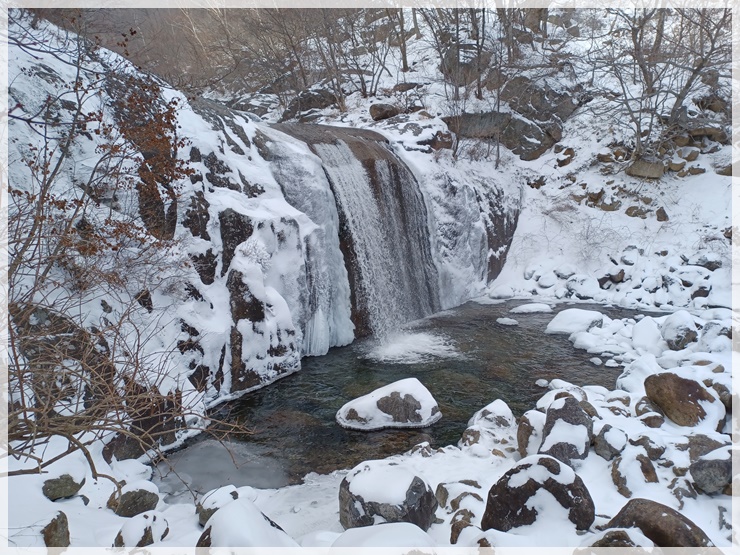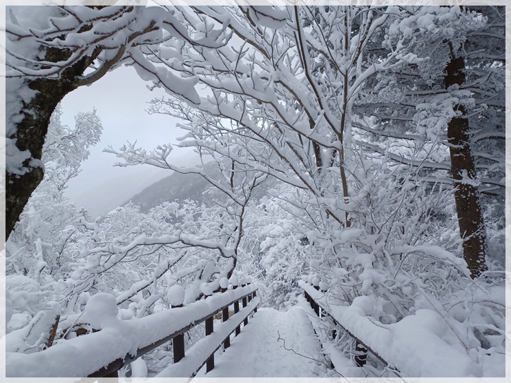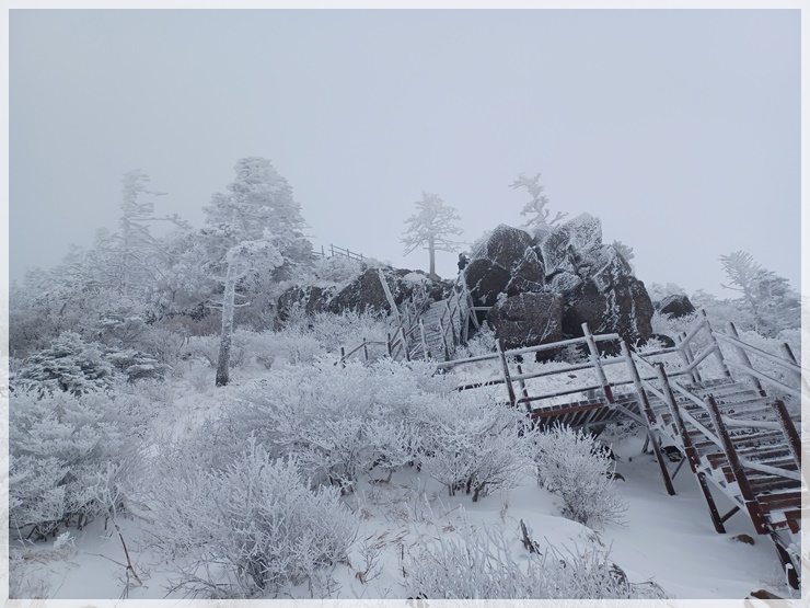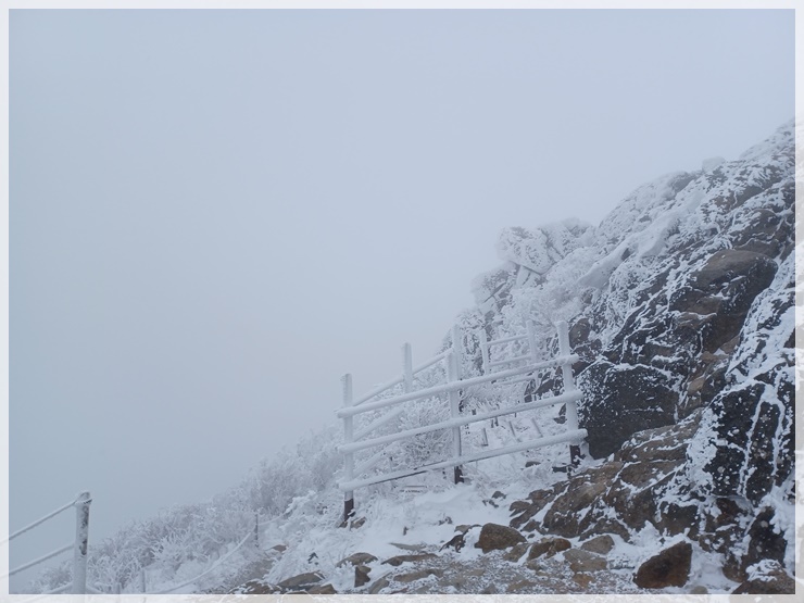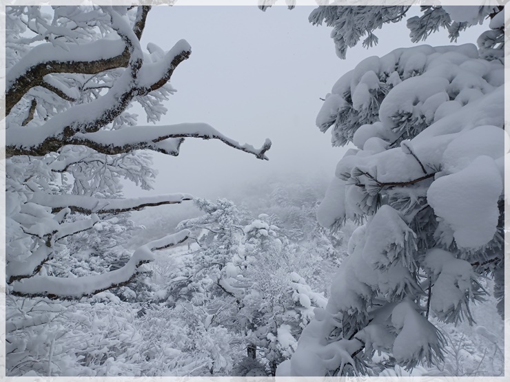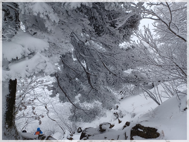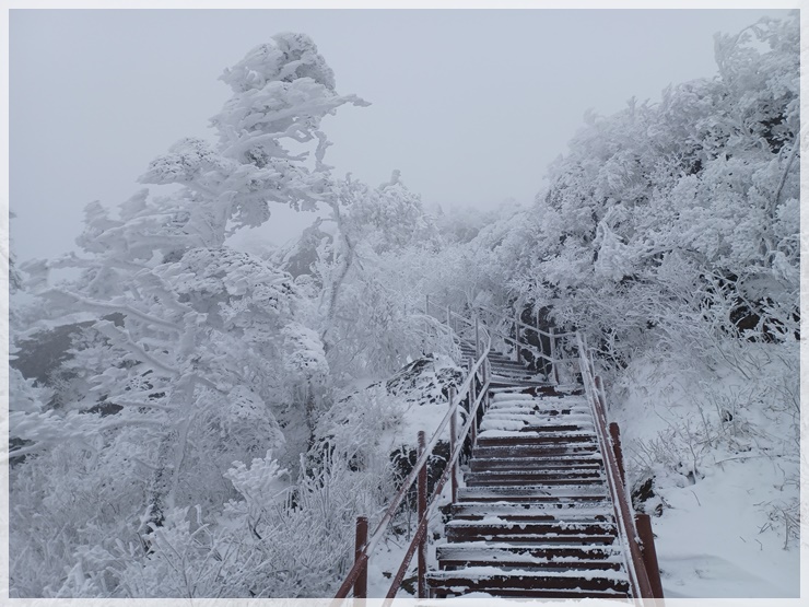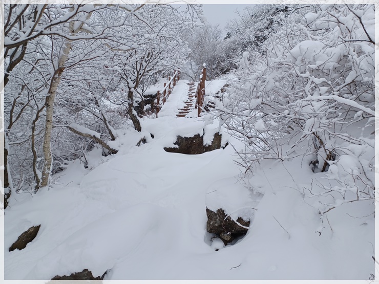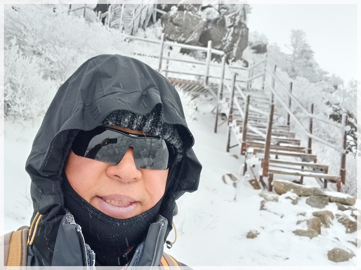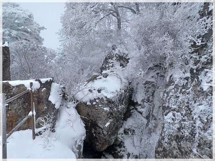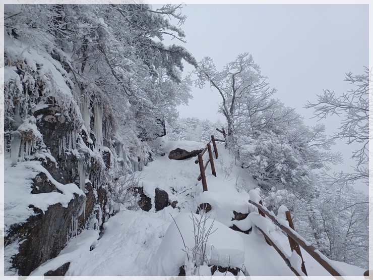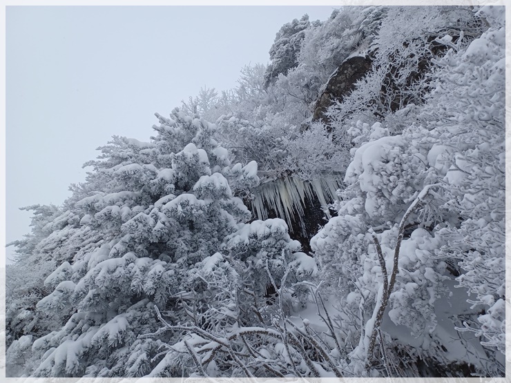 개선문 눈꽃과 천왕샘 고드름 병풍이 정신을 혼미하게 합니다. 천왕봉 오르는 계단 길에서 『아이 좋아라 아이고 좋아라』 를 계속 중얼거렸습니다. 손이 시린 줄도 모르고 계속해서 사진을 찍었습니다. 덕규형님 폰의 배터리가 닳아 없어져 수시로 사진을 찍어 드려야 하니 장갑 벗을 일이 더 많아졌습니다.