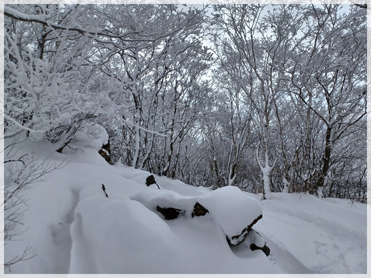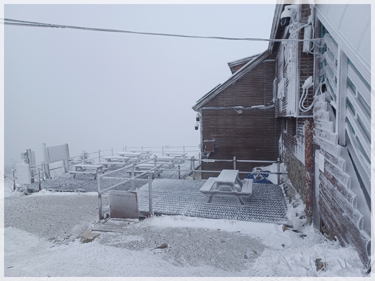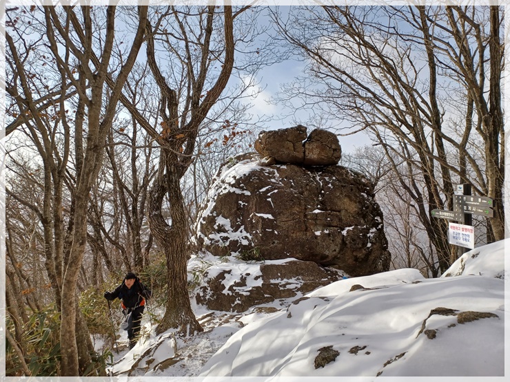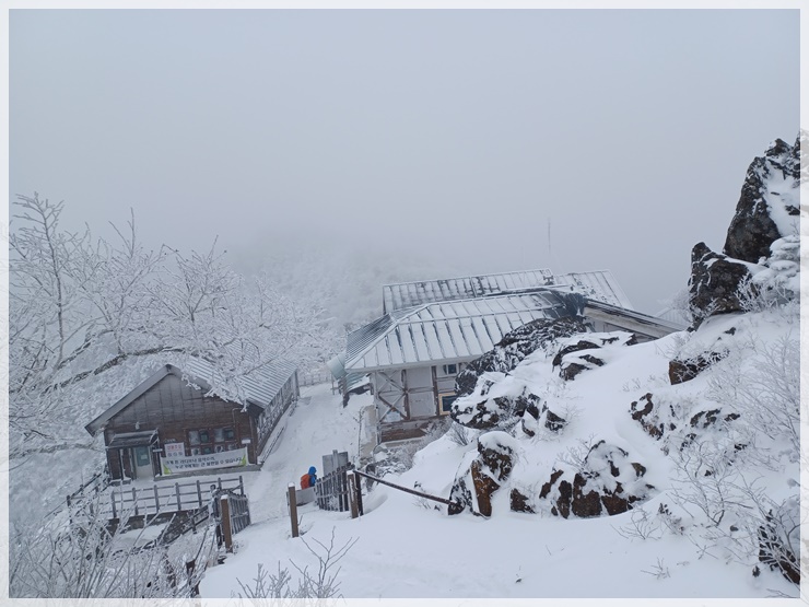 등로에 흩뿌려진 잔설을 밟으며 산행하는 기분이 아주 좋습니다. 반면 꽁꽁 얼었을 것이라 예상했던 법천계곡 물 흐르는 소리는 경쾌하게 들립니다. 칼바위와 망바위를 지나 로타리대피소에 도착합니다. 날씨가 워낙 추워 평소 잘 들르지 않던 대피소 취사장에 들어가니 거제에서 오신 2쌍의 부부님을 만납니다. 같은 동네 분들을 만나니 그냥 반갑습니다.