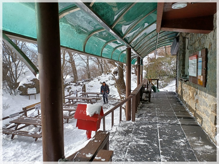 장터목대피소 취사장에 들어가 컵라면과 삼각김밥으로 배를 채우려니 집에 두고 온 식자재와 취사도구가 너무 아쉽습니다. 몸도 마음도 뱃속이 너무 썰렁해 바로 하산입니다. 대피소 아래 하산길이 쌓인 눈으로 정말 미끄럽습니다. 조심만이 살 길입니다. 중산리 탐방안내소에 도착하니 기온은 차가워도 햇살로 길바닥 잔설은 다 녹고 없습니다.