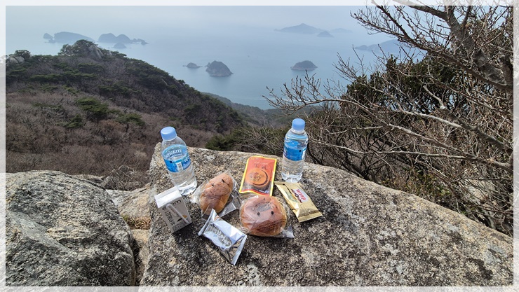 래봉산 정상에 아주 잔칫상이 차려졌습니다. 막걸리 한잔 하고 가라 하지만 운전을 이유로 정중히 사양하고 호연암에서 퍼질러 앉아 빵 먹었습니다. 남해 바다를 바라보며 한참동안 멍 때렸습니다.