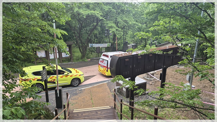 칼바위 삼거리에서 굵은 빗방울이 떨어져 우의를 걸쳤습니다.
