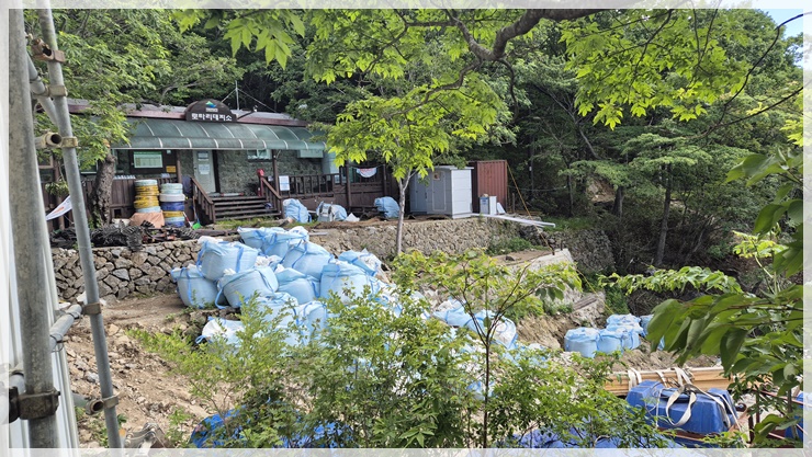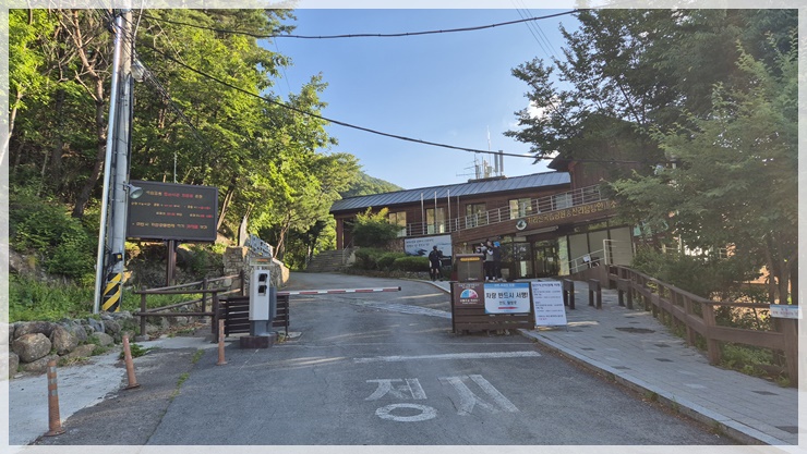 중산리 탐방안내소 앞 주차장 공사와 진입도로변 주차금지 차단봉 설치로 인해 차량 주차가 어렵게 되었습니다. 약간의 융통성을 발휘하여 하루 전 거북이산장 식당에 아침식사를 예약했습니다. 아니나 다를까 중산마을 오르막 진입도로에서 해병 전우회 아저씨 두 분이 차량 진입을 막습니다. 식당 예약손님을 확인하고서야 진입을 허락합니다. 어차피 해결해야 하는 식사인데 주차와 산행들머리 접근이 쉬우니 완전 꿩 먹고 알 먹고 이니 효과 만점입니다. 중산리 탐방안내소 앞 주차장이 완성되기까지는 아침식사로 즐겨 찾던 덕산 황태해장국 먹기는 어려울 것 같습니다.