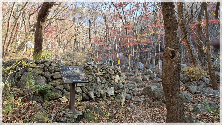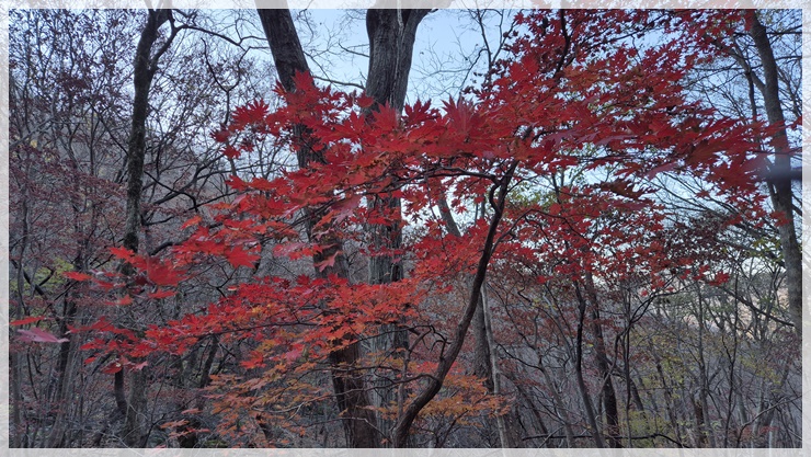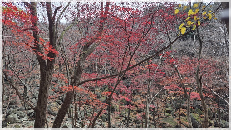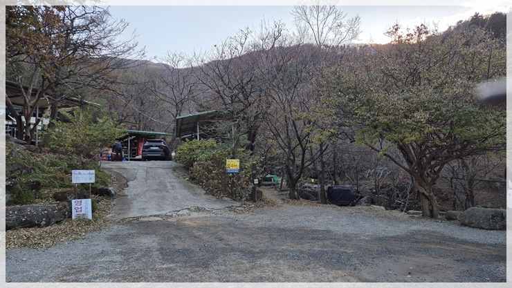 병암산장 마당에 주차하니 사장님이 보고 계십니다. 하산할 때 식사하겠다니 표정이 밝아졌습니다. 산장에 묶여있던 백구가 줄이 풀려 우리 뒤를 쫄쫄 따라옵니다. 계곡에는 물 흐르는 청아한 소리가 귀를 즐겁게 하고 빨간 애기단풍 색깔이 눈을 행복하게 합니다.