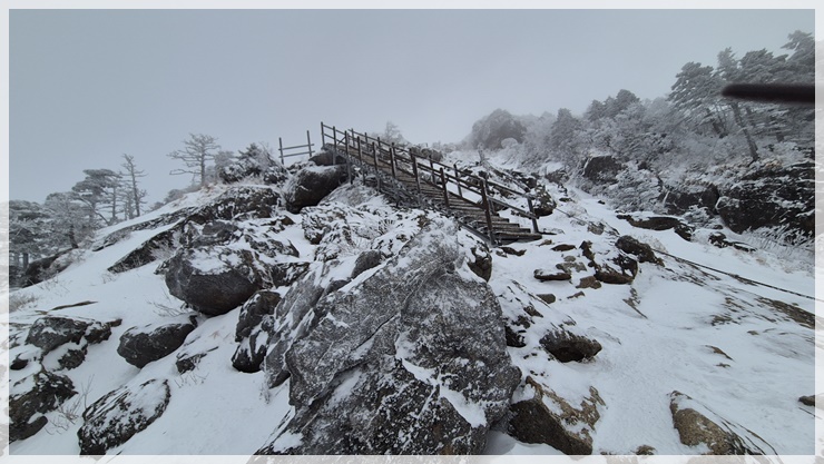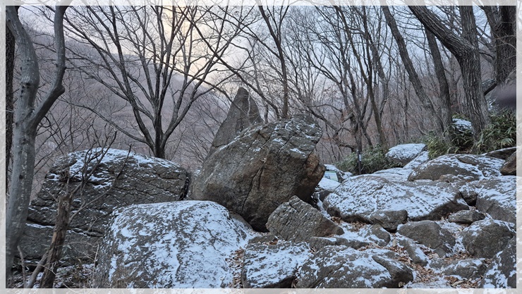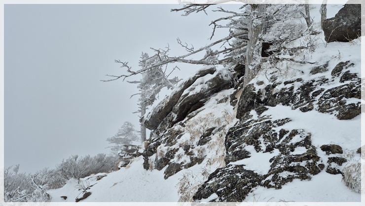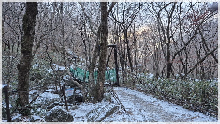 중산리 등로 초입에는 잔설이 바람결에 흩날립니다. 올 겨울 들어 처음으로 밟아보는 눈이라 한층 기분이 업그래이드 됩니다. 즐겁습니다. 쳇기가 있어 어제저녁 식사를 건너 뛰었는데 아직까지 속이 불편합니다. 망바위에서는 아이젠을 착용했습니다.