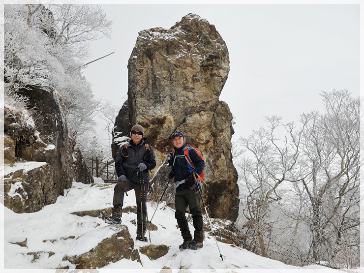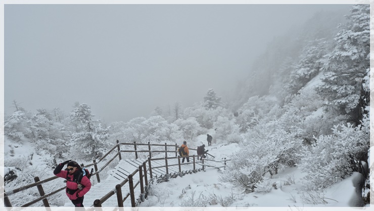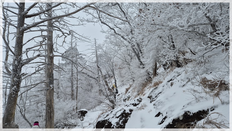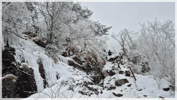 이제부터 설경 속 산행이 시작됩니다. 천왕샘 위 계단에서 한 떼의 몽골인 남녀들이 내려옵니다. 몽골에도 엄청난 눈이 내렸을 것인데 대한민국의 최고봉 지리산 천왕봉을 찾아 겨울산행에 나선 외국인 젊은 청춘들이 아름답고 고맙습니다.