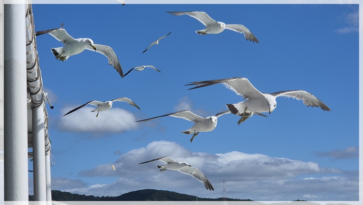 비진도를 왕복하는 한솔 페리호에 여름 피서객으로 북적이고 선체 내외부가 깔끔합니다. 다만 화장실 변기에 물이 올라오지 않아 비우기를 포기했습니다. 딱 10년만에 찾는 비진도 산행이라 살짝 설레기도 합니다. 오늘 발걸음의 목적이야 산행이지만 페리호를 타고 가는 비진도 여행이라 생각했습니다. 새우깡 따라오는 갈매기도 한 멋 합니다.