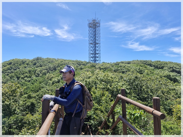 학동고개에서 거제지맥과 남파랑길을 따라 망치고개와 북병산 방향으로 향합니다. 경사는 완만하지만 꽤 먼 능선길이라 숨이 턱밑까지 올라옵니다. 언젠가 지인께서 운명을 달리한 장소인 거대한 통신탑이 있는 448봉 주위에서는 막걸리 한잔 올리고 잠깐의 쉼을 가진 후 발걸음을 재촉합니다. 앞서 가시던 덕규 형님이 시끌시끌합니다. 도저히 사람이 있을 것 같지 않은 그런 산중에서 지인을 만났다며 엄청 반가워합니다.